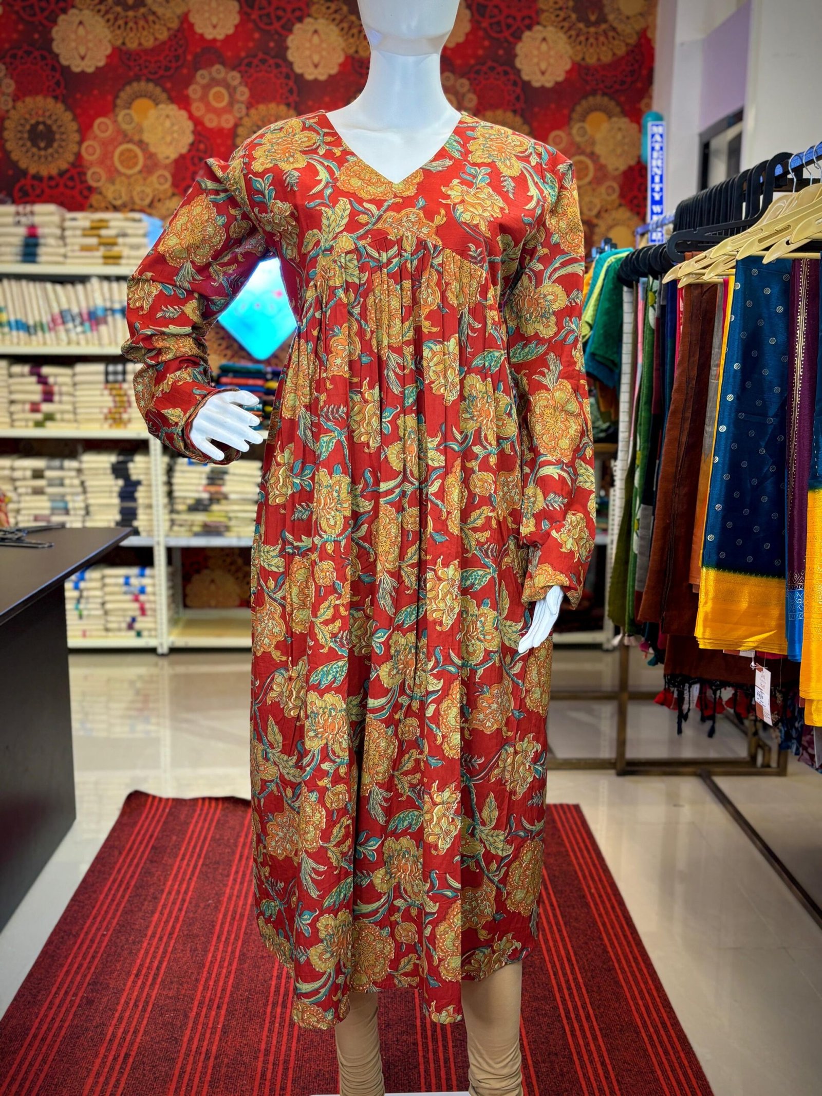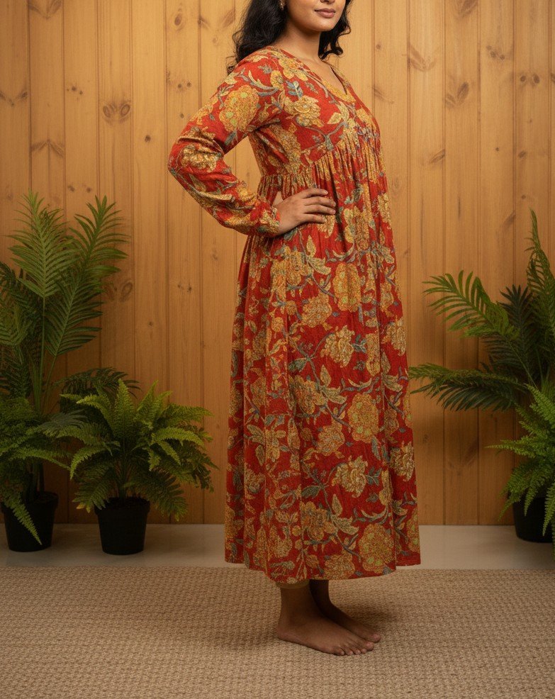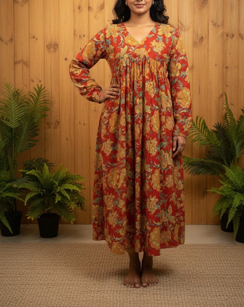 The chudi sleeves add a touch of traditional charm, making it ideal for both casual outings and festive occasions. The structured A-line pattern ensures a beautiful fall, while the soft inner lining provides extra comfort and durability.