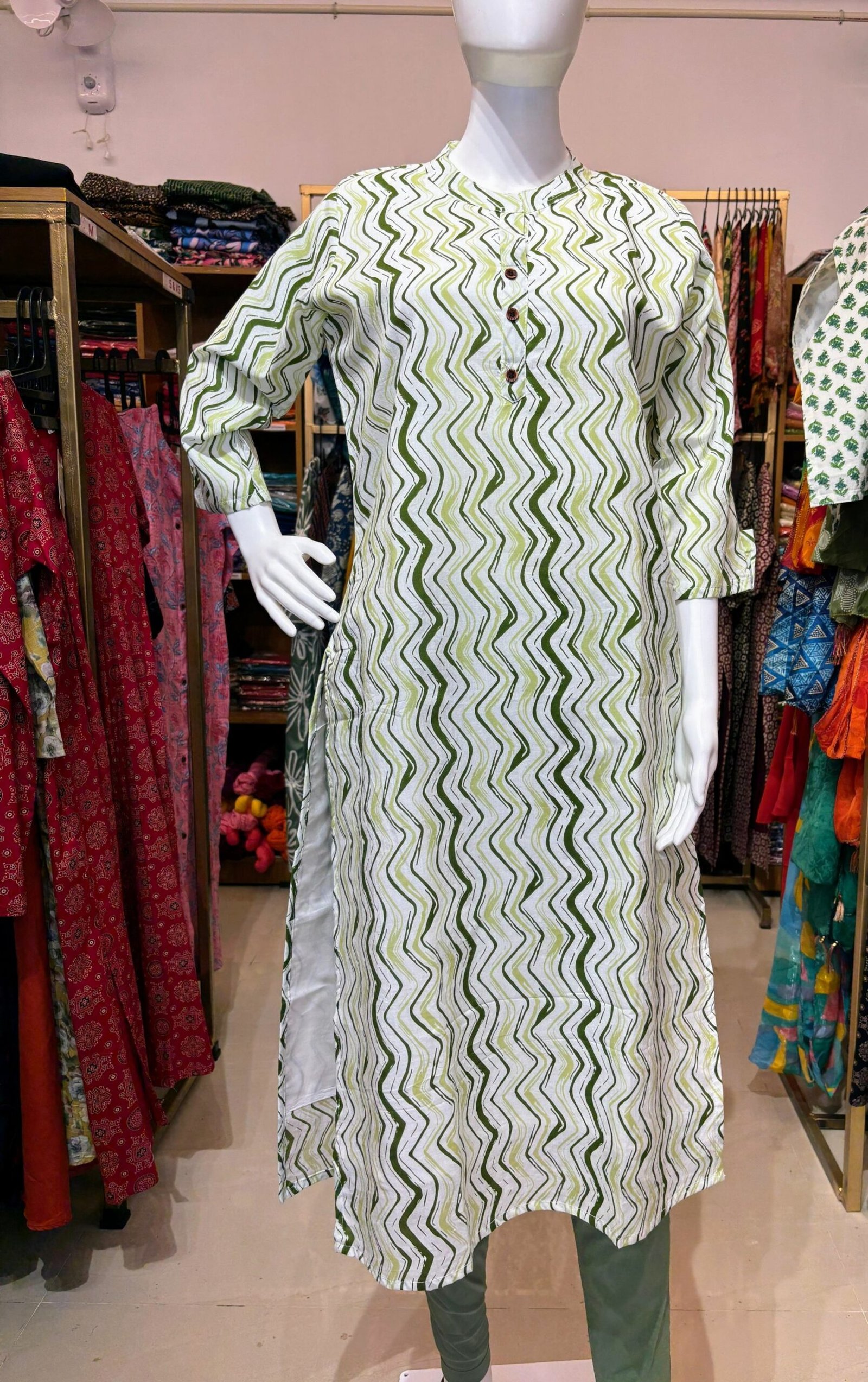 Step into effortless elegance with this beautifully crafted printed kurti. Designed with a soft inner lining for added comfort and a refined finish, it drapes gracefully while maintaining structure. The classic straight silhouette is enhanced with stylish side slits, offering ease of movement and a contemporary touch.