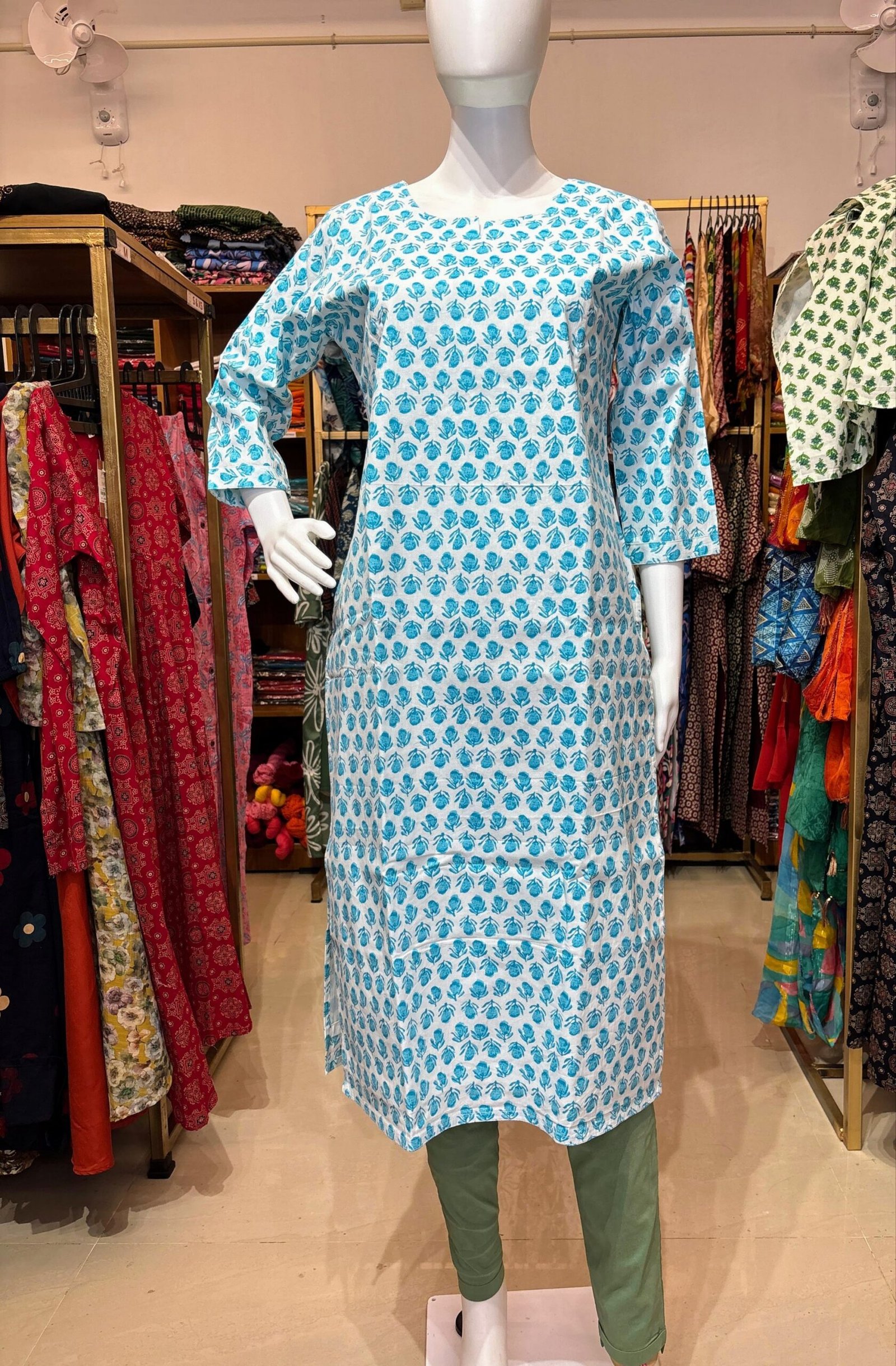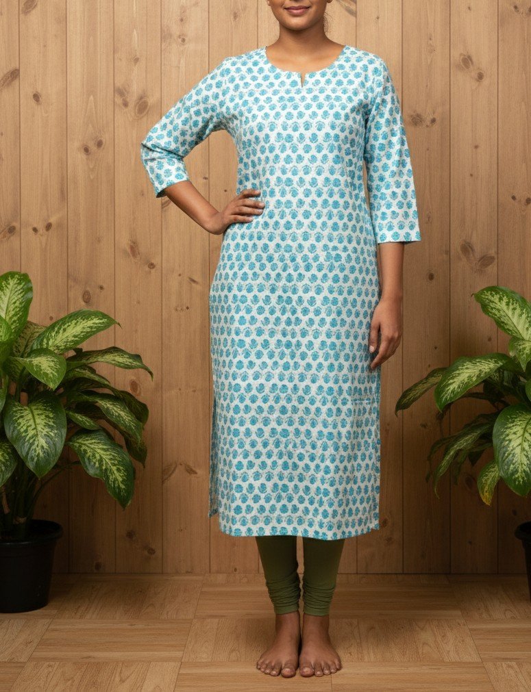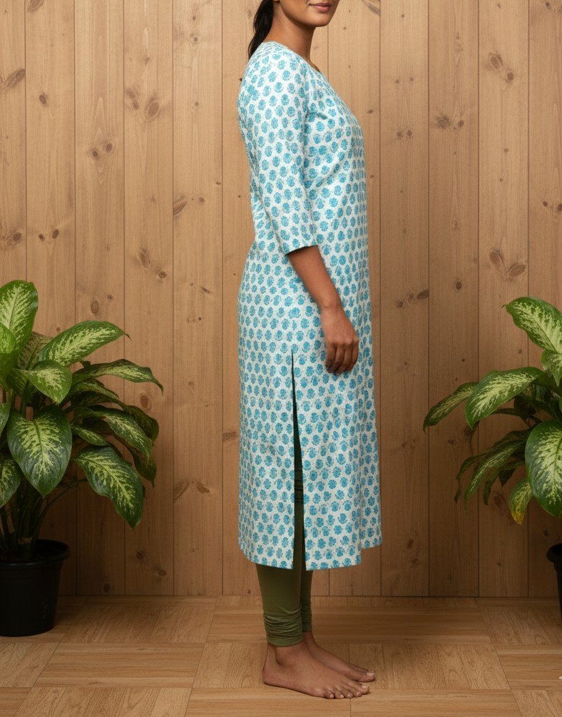 Step into effortless elegance with this beautifully crafted printed kurti. Designed with a soft inner lining for added comfort and a refined finish, it drapes gracefully while maintaining structure. The classic straight silhouette is enhanced with stylish side slits, offering ease of movement and a contemporary touch.
