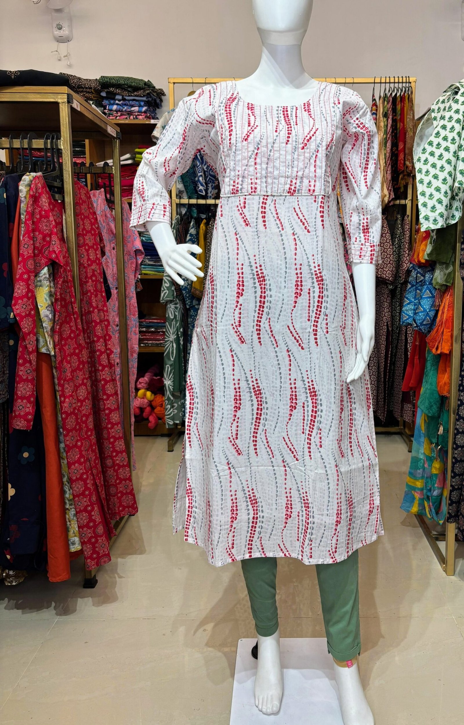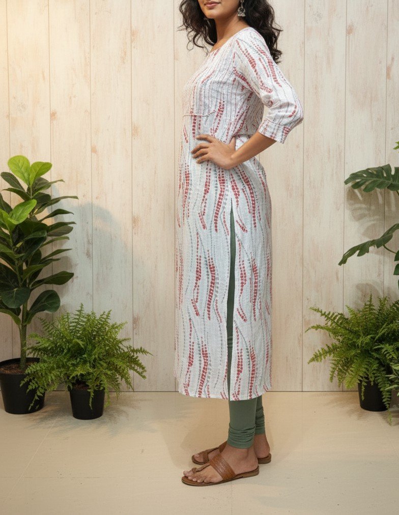 Step into effortless elegance with this beautifully crafted Dots print kurti. Designed with a soft inner lining for added comfort and a refined finish, it drapes gracefully while maintaining structure. The classic straight silhouette is enhanced with stylish side slits, offering ease of movement and a contemporary touch.