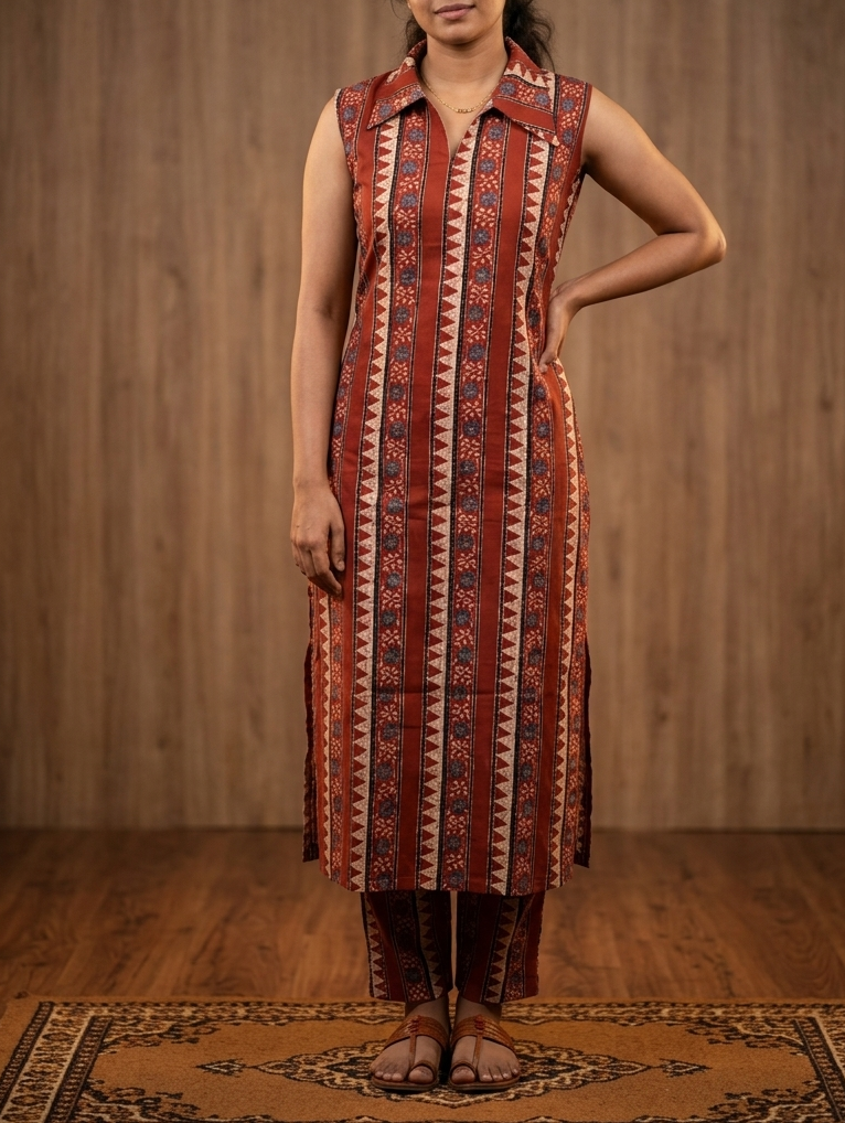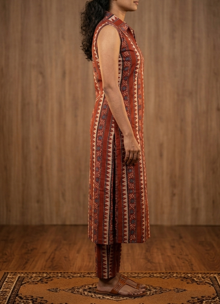 Pair this set with tan block heels or traditional Kolhapuris and minimal gold jewelry to highlight the earthy tones and intricate geometric patterns.