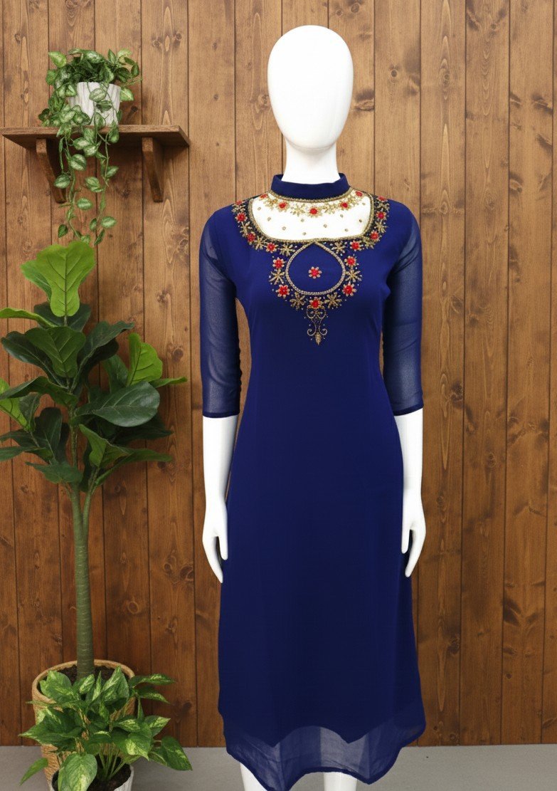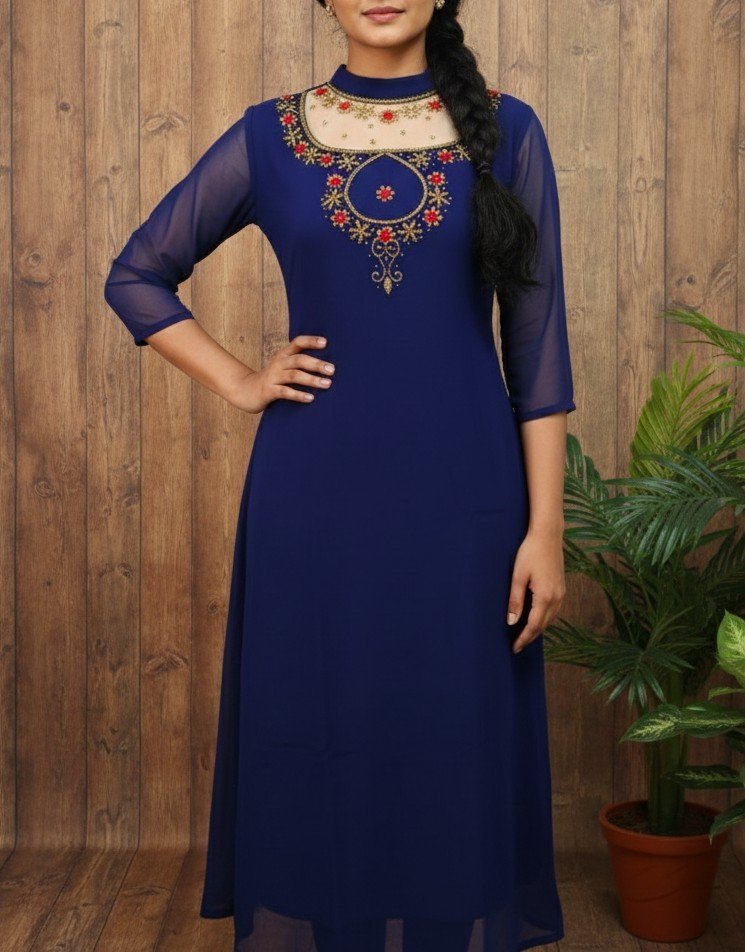 Crafted from premium soft georgette fabric, this kurta offers a graceful fall and fluid silhouette that flatters every body type. The heavy jewel neckline adorned with intricate embroidery and embellishments adds a rich, luxurious appeal — perfect for weddings, festivals, parties, and special occasions.