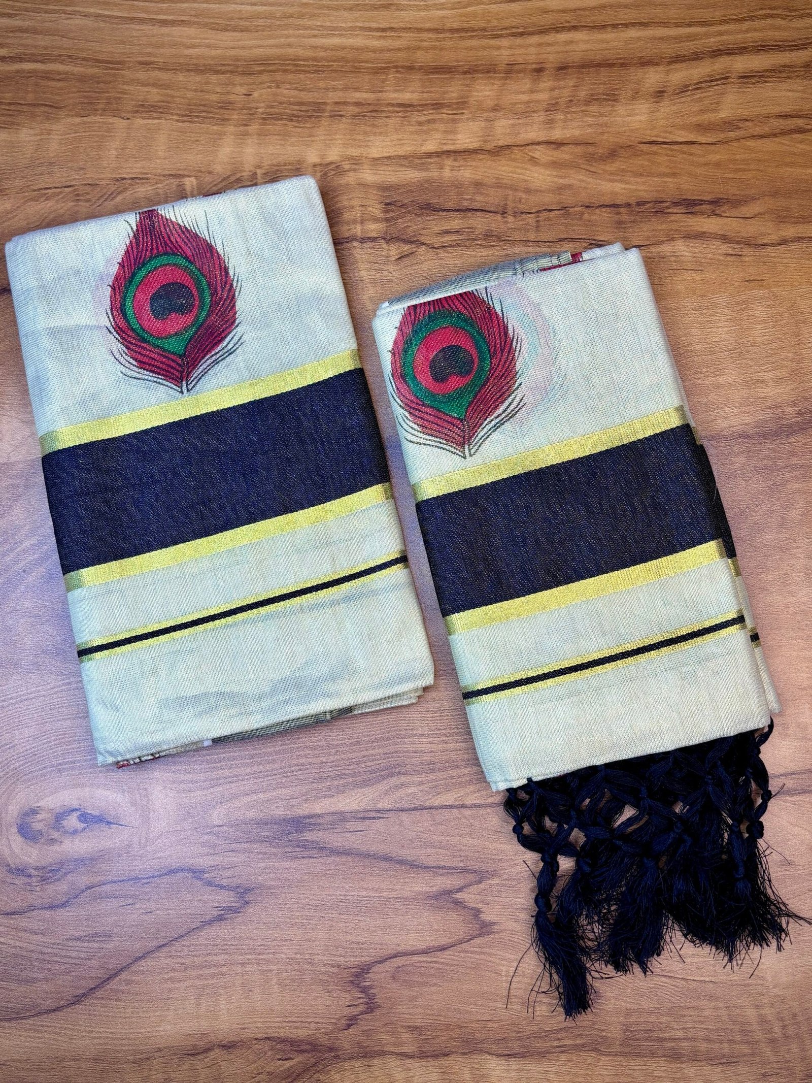 Enhance your traditional elegance with this beautifully crafted Kerala Tissue Set Mundu (Mundum Neriyathum), designed for women who love timeless style with a modern touch. Featuring kasavu border and eye-catching peacock feather motifs, this set perfectly blends tradition and sophistication.