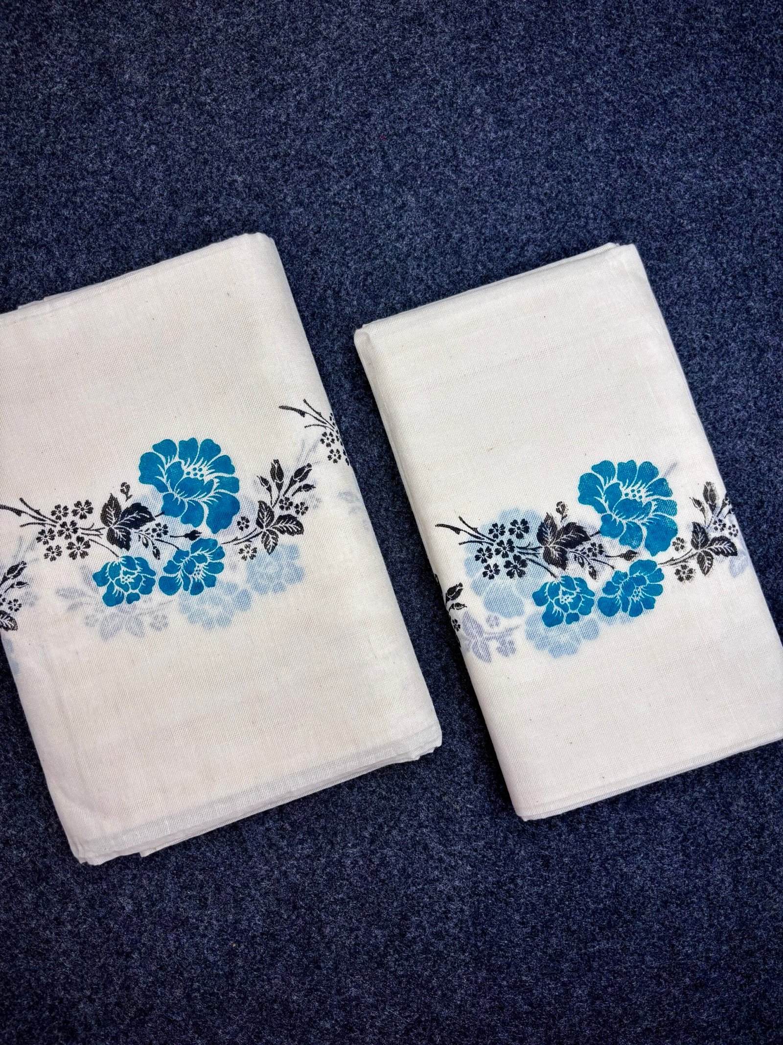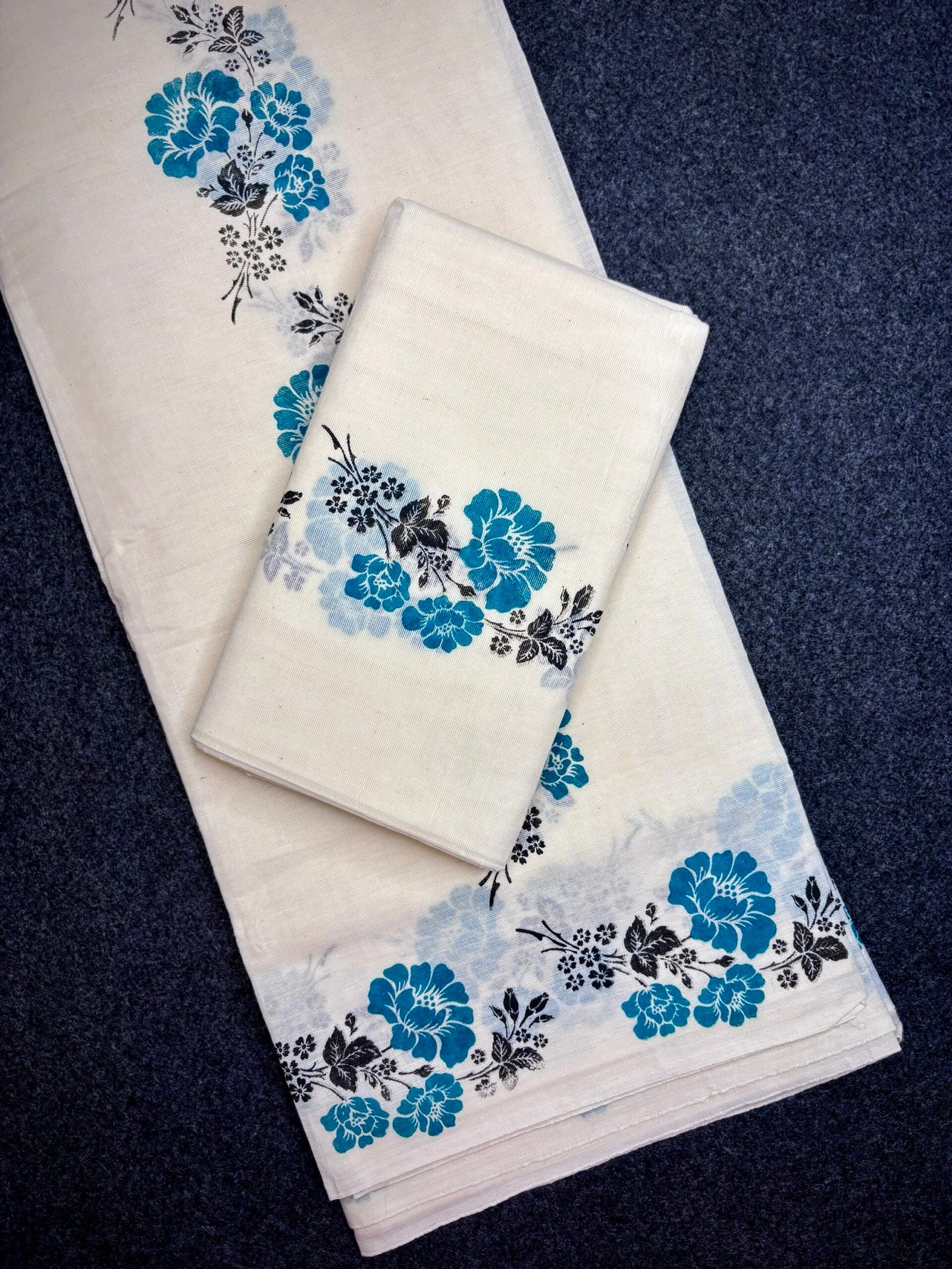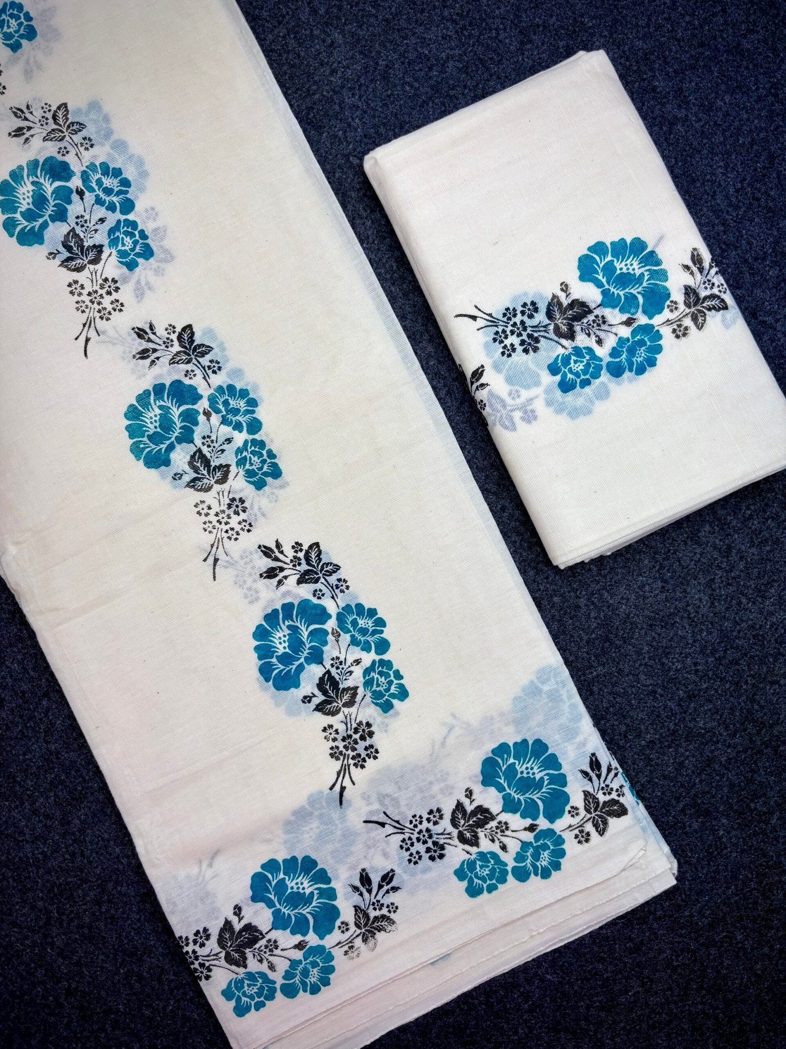 The subtle off-white base is enhanced with a charming blue floral print, adding a modern touch while preserving its classic appeal. Ideal for festive occasions, temple visits, and cultural celebrations, this set mundu blends tradition with style effortlessly.