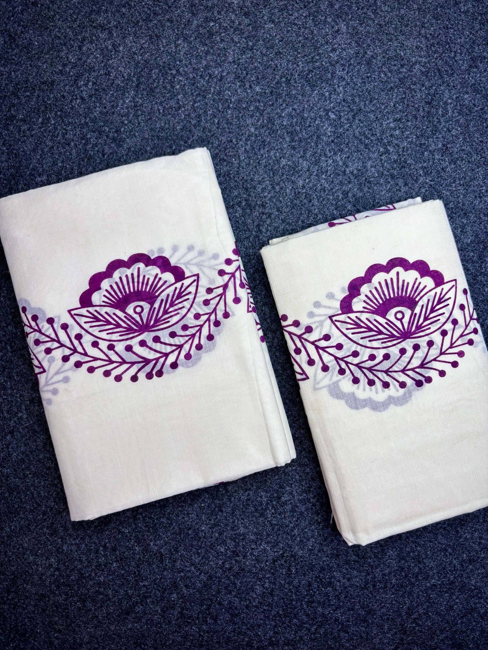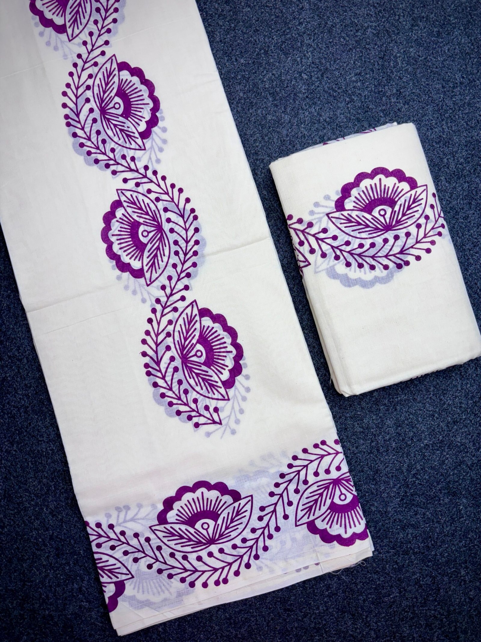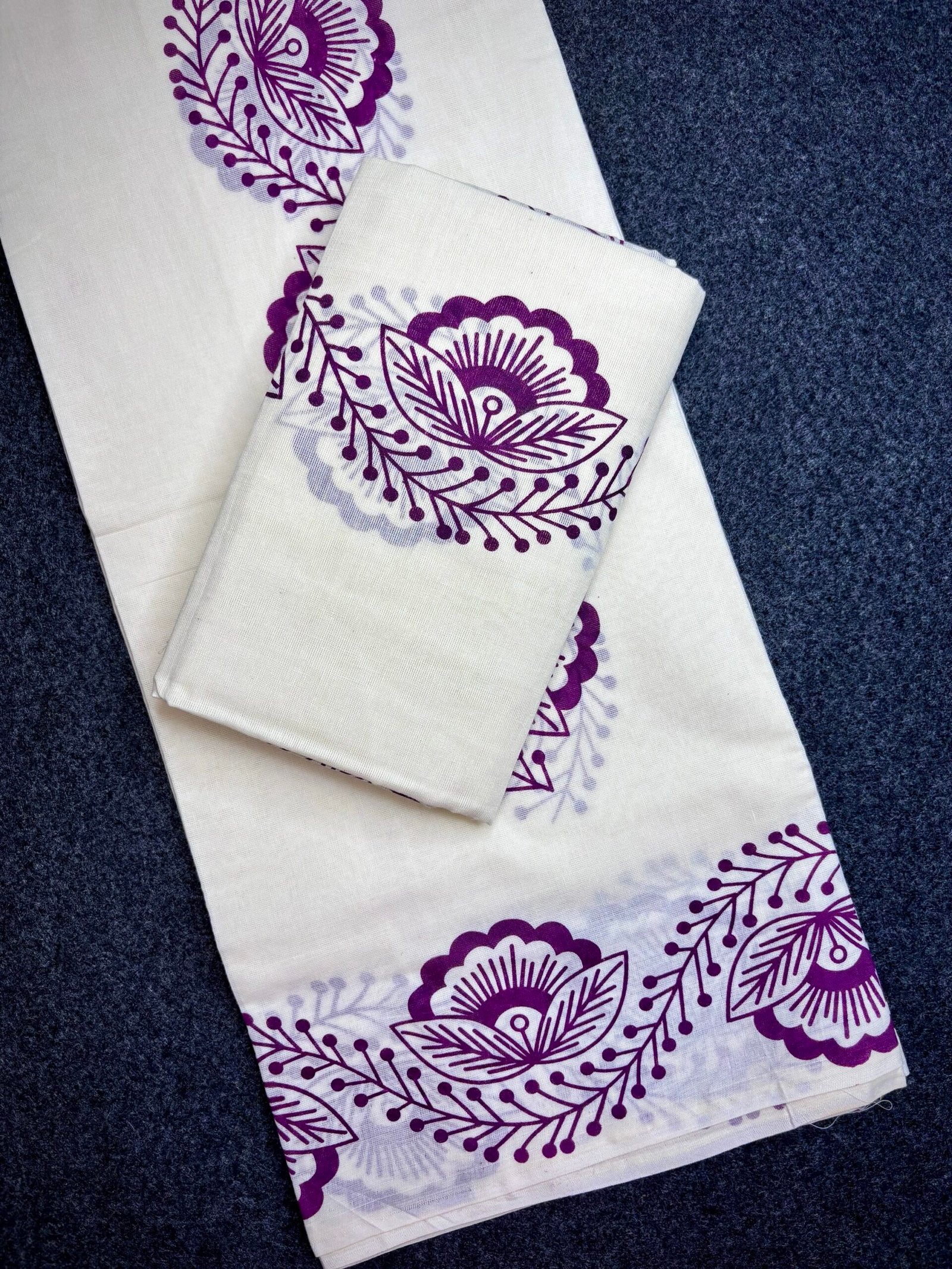 Bring home the charm of Kerala tradition with this beautifully designed Gada Cotton Set Mundu. Crafted from high-quality cotton, this 2.60-meter set mundu offers a perfect blend of comfort, elegance, and cultural grace. The off-white base is enhanced with a striking purple floral print along the border and body, giving it a fresh and modern ethnic appeal.