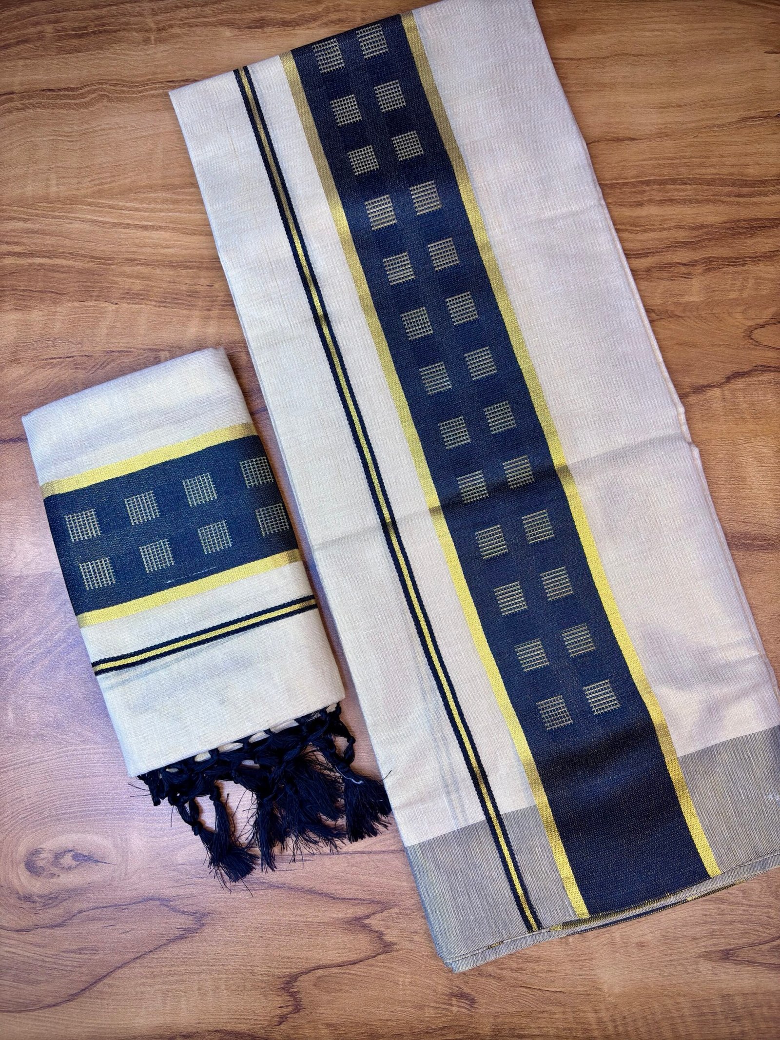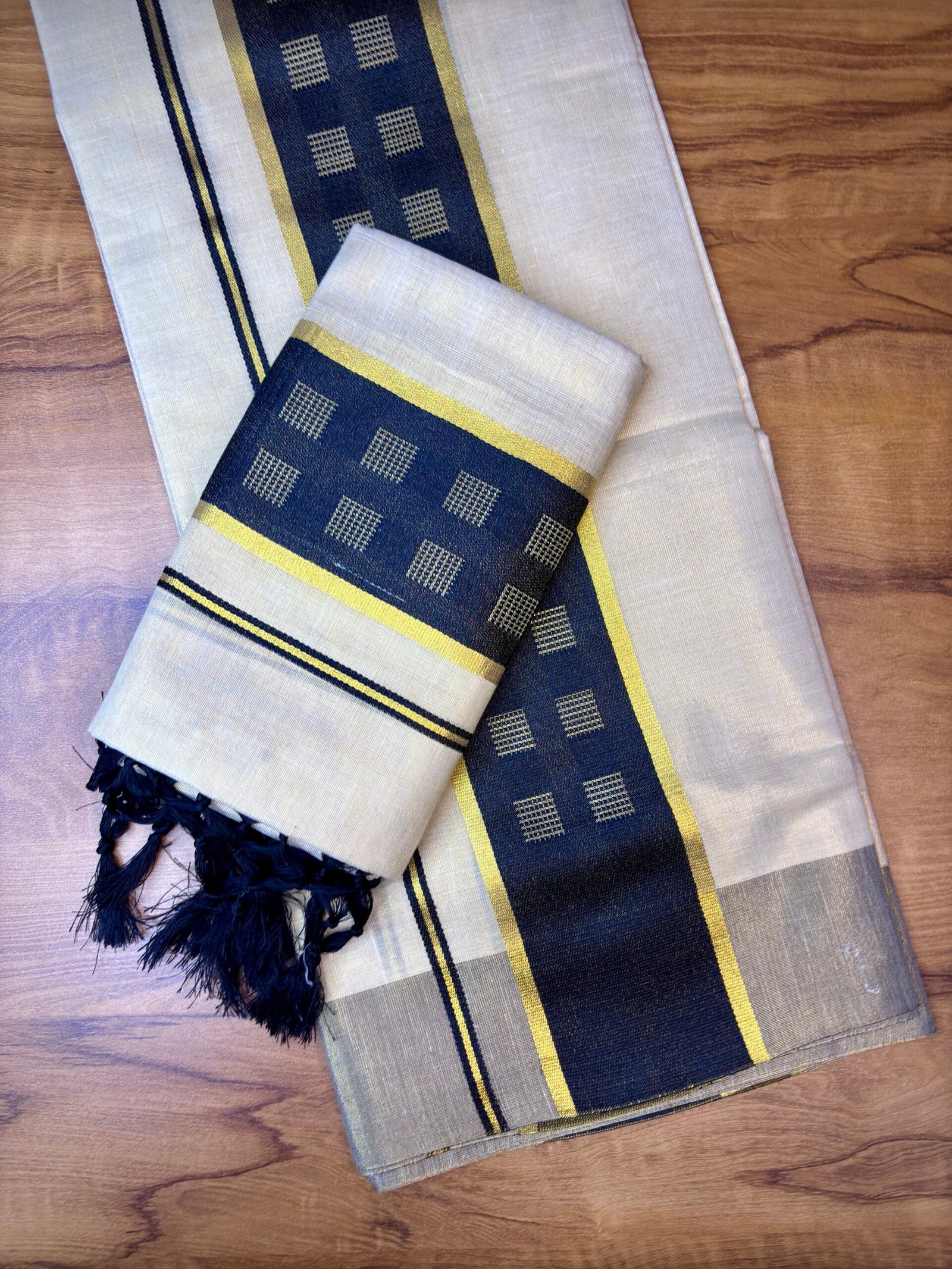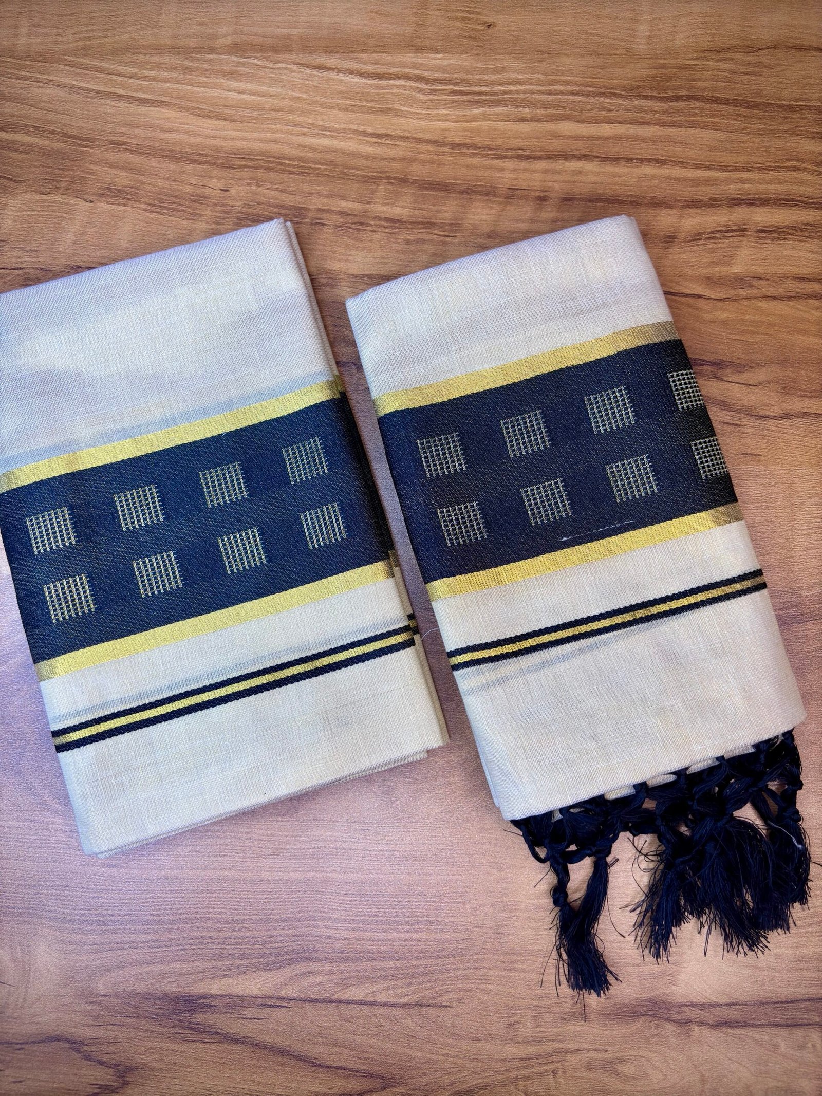 Design: Elegant black and gold kasavu-style border with subtle geometric motifs