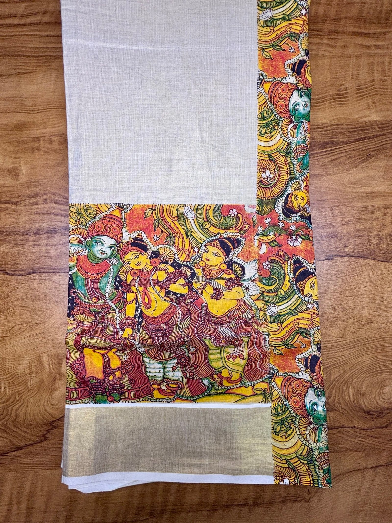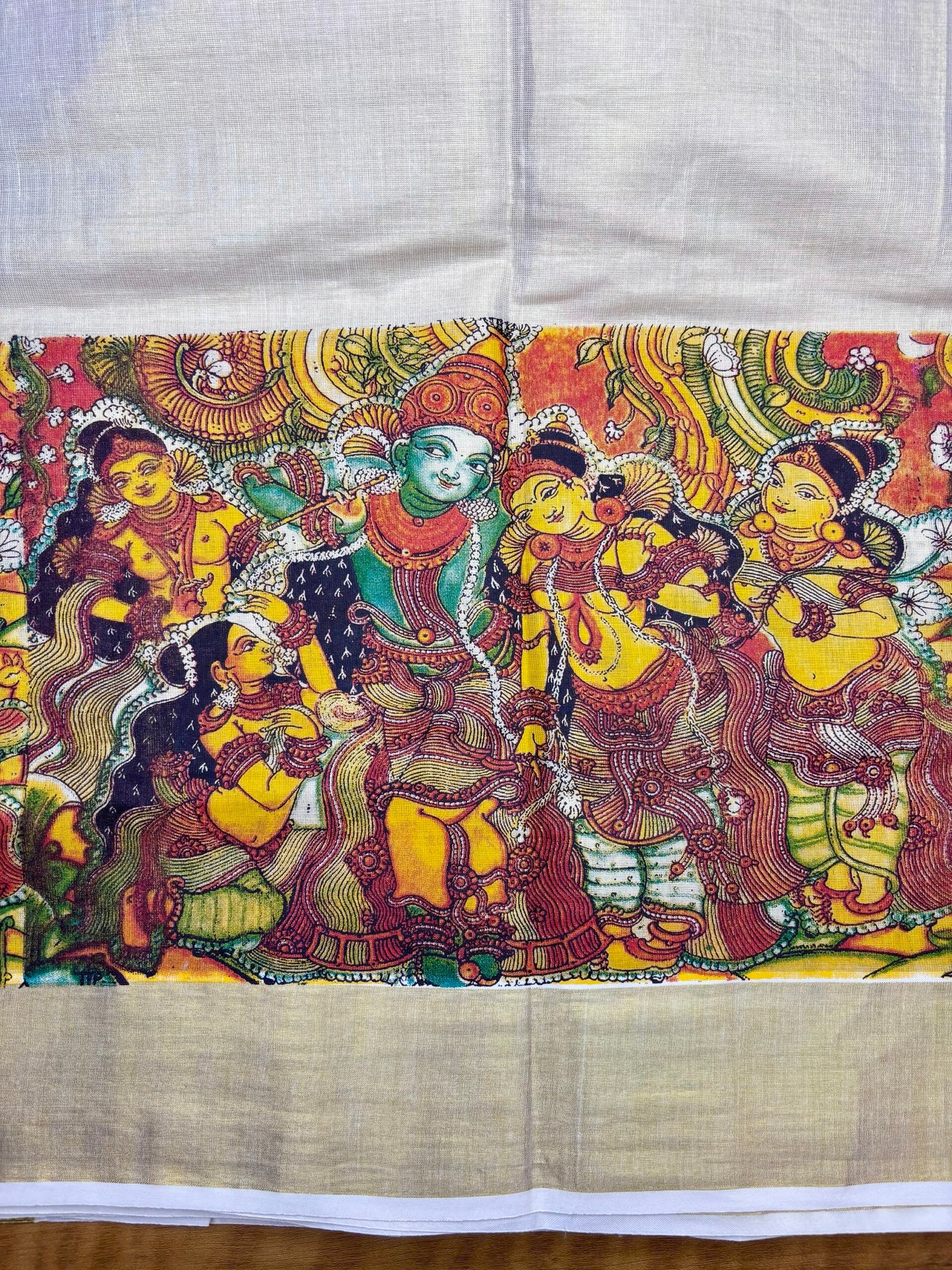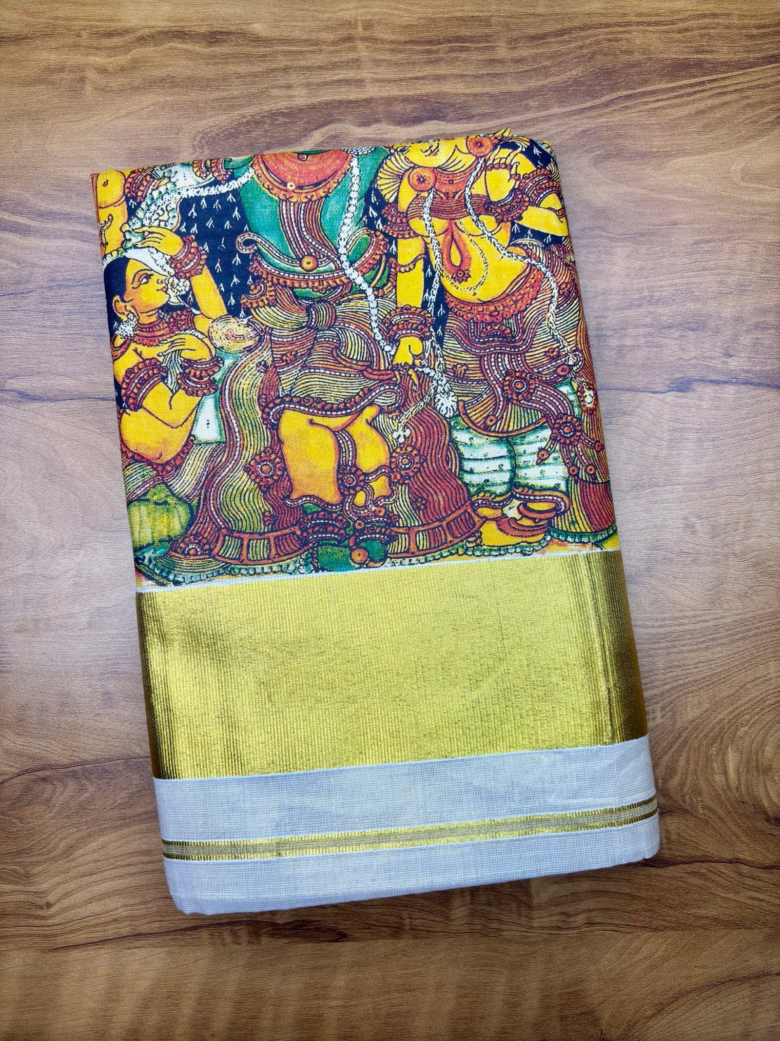 Design: High-quality digital print with traditional Kerala mural art