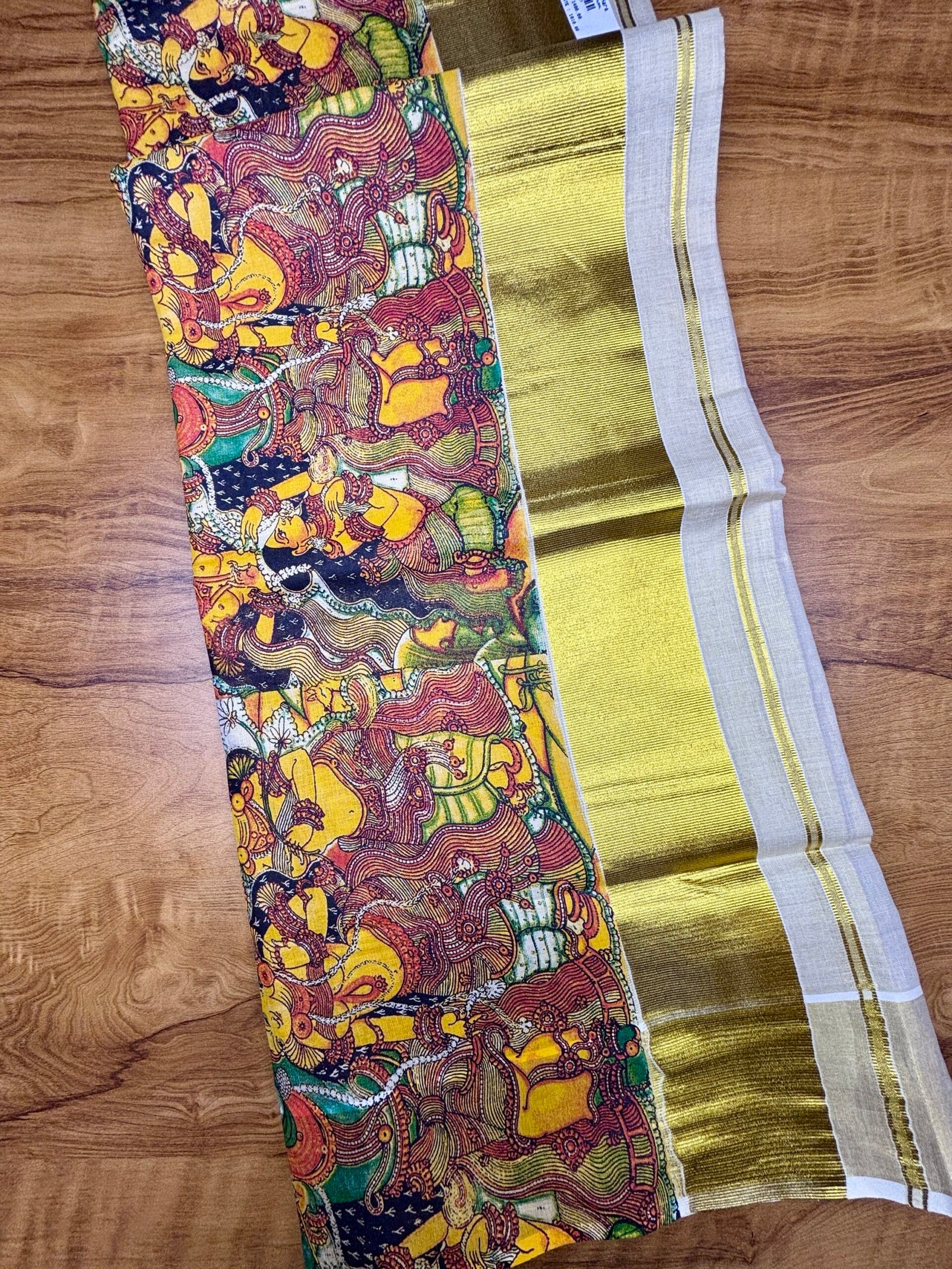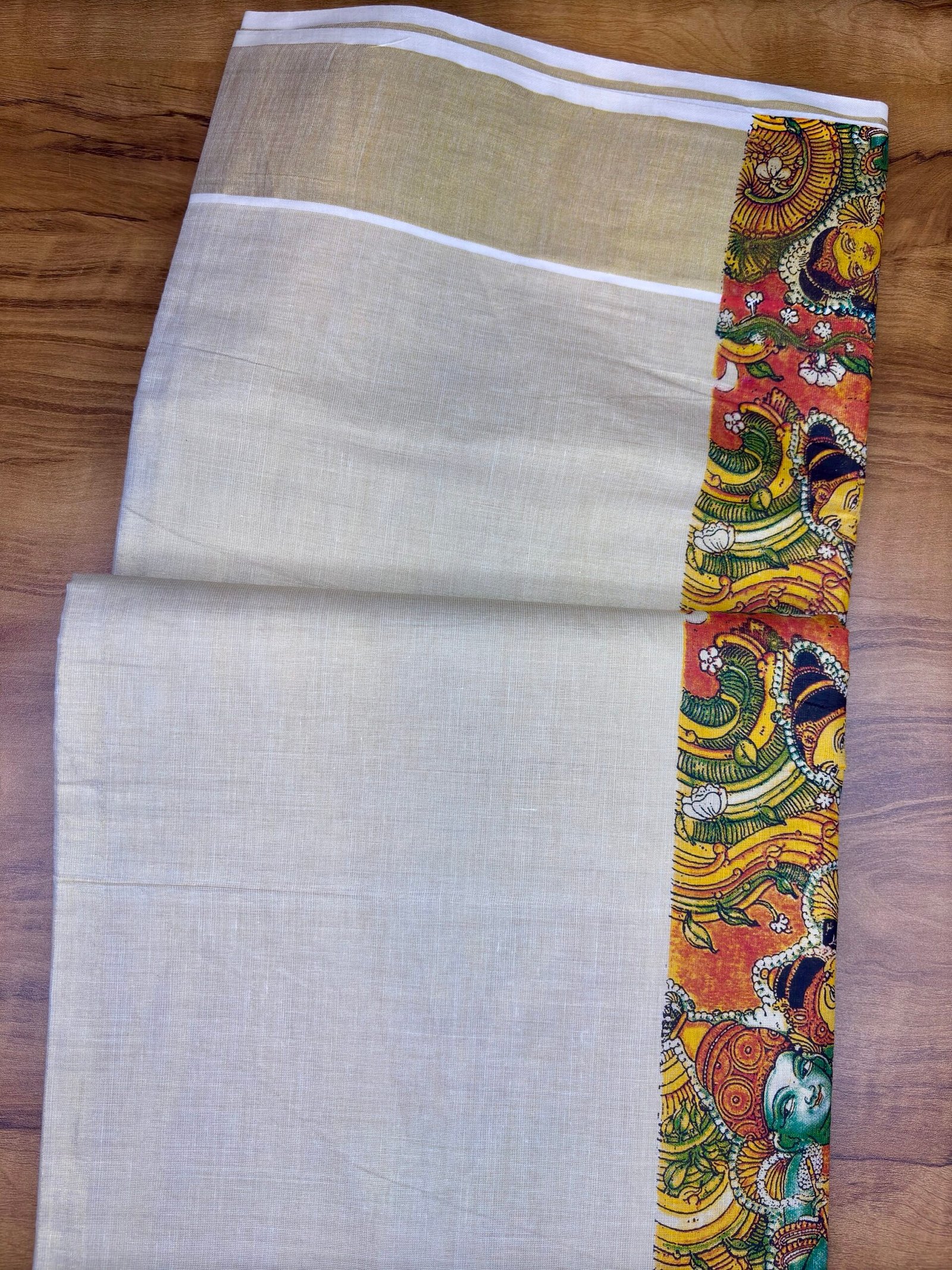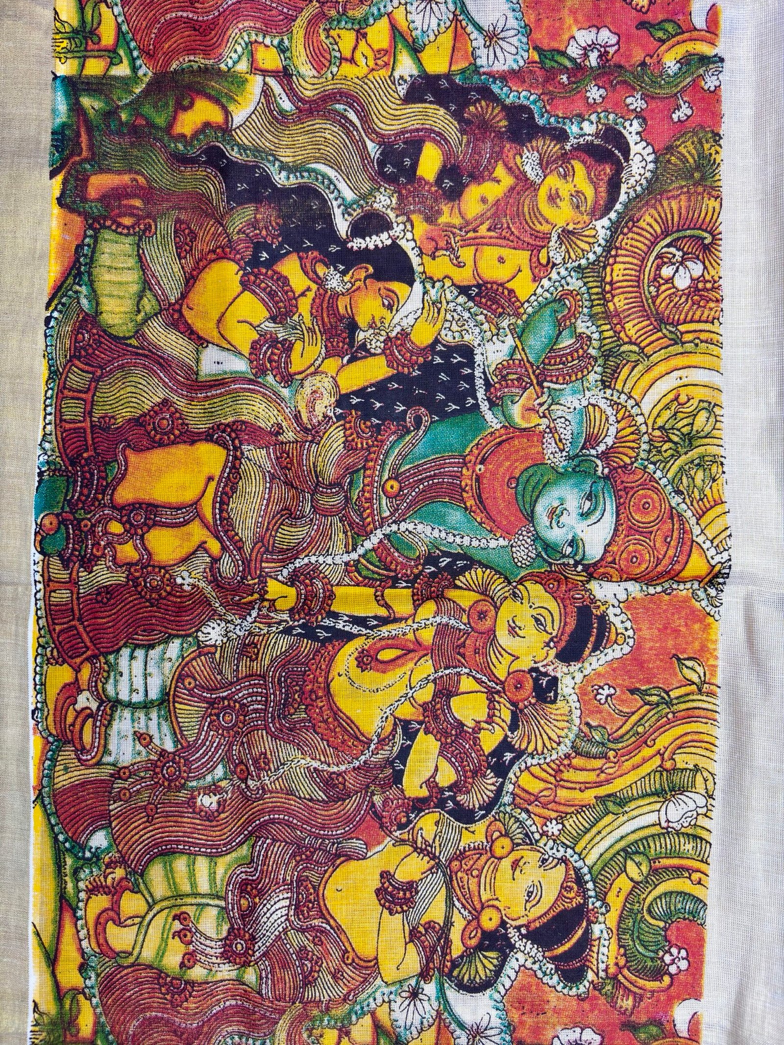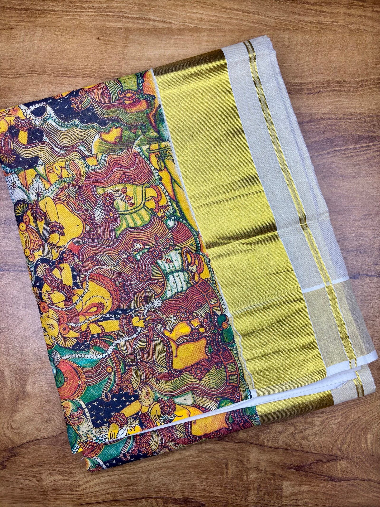 Design: High-quality digital print with traditional Kerala mural art