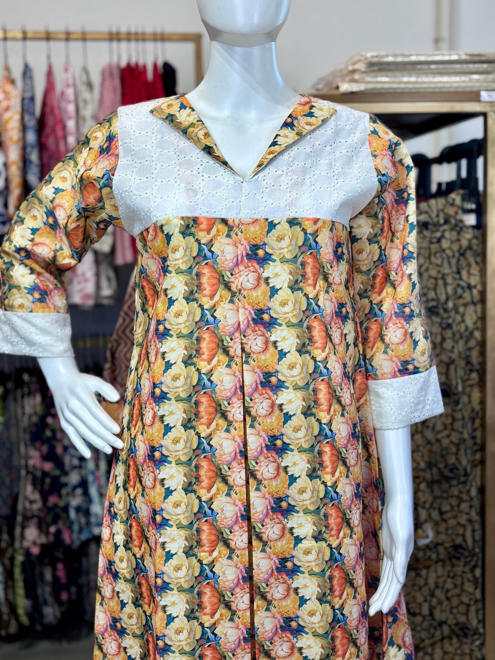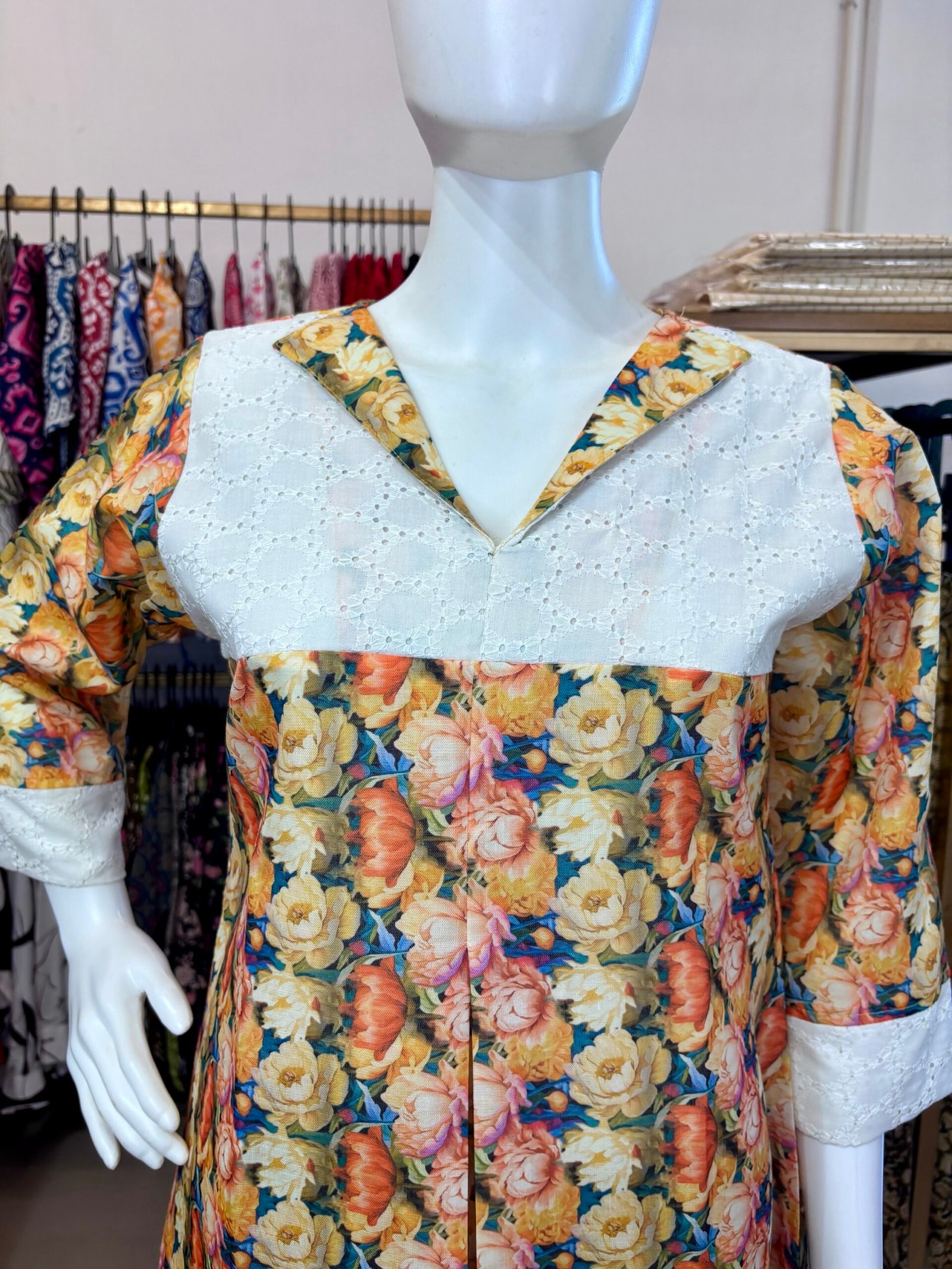 Neckline & Yoke: A unique V-neckline framed by a crisp white broderie anglaise (eyelet) yoke. This contrasting texture adds a touch of elegance and visual interest to the chest and shoulders.