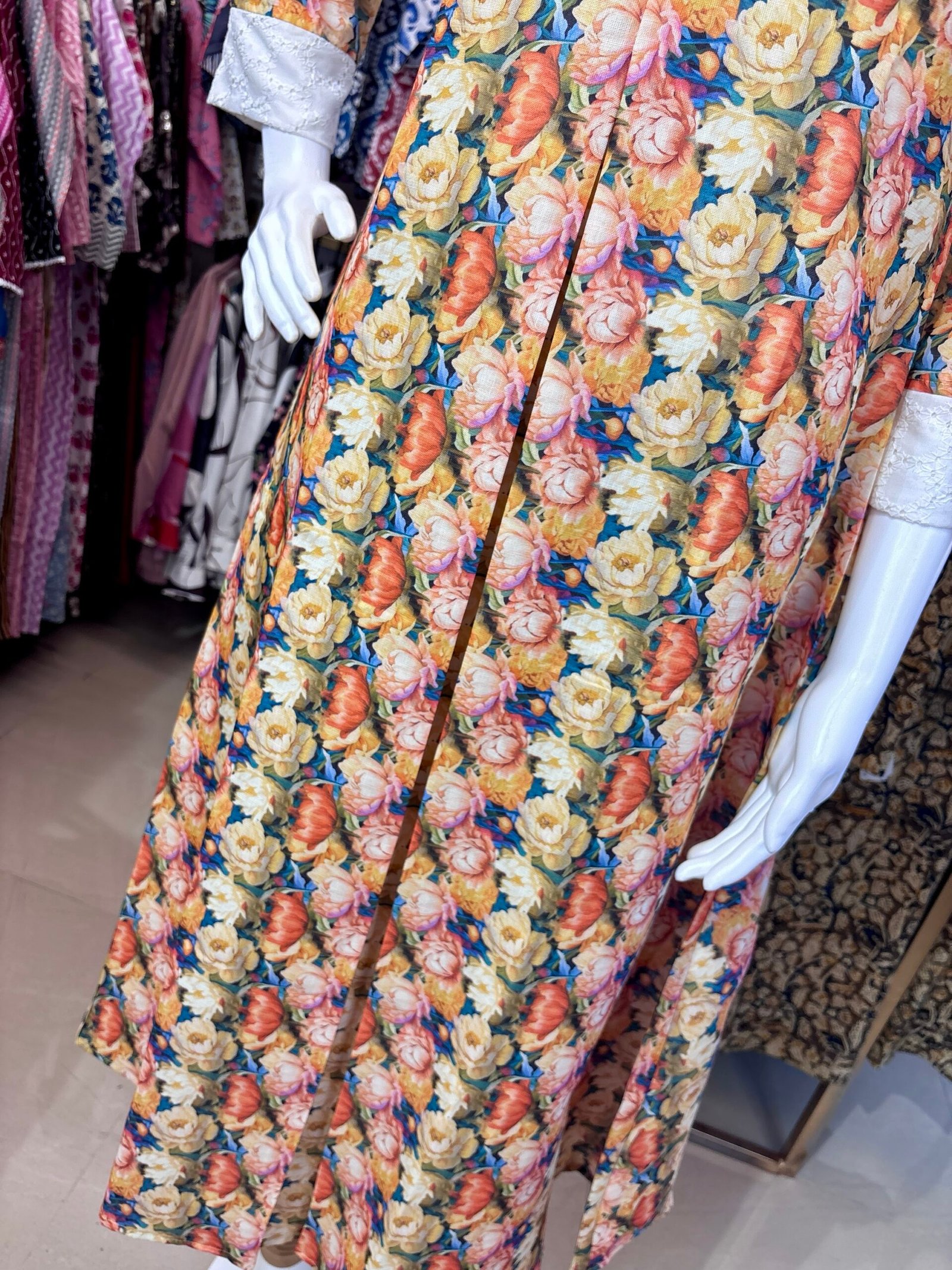 Linen Hakoba Floral Print A line Kurti (1253B)