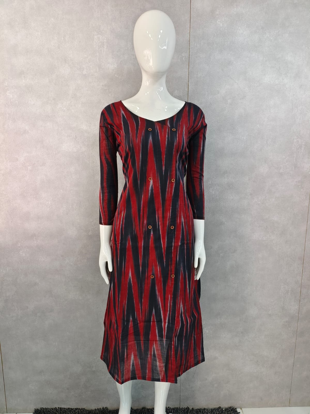 Women’s Cotton A-Line Ikat Print Kurti – Stylish 3/4 Sleeve Casual Tunic with Asymmetrical Button Detail