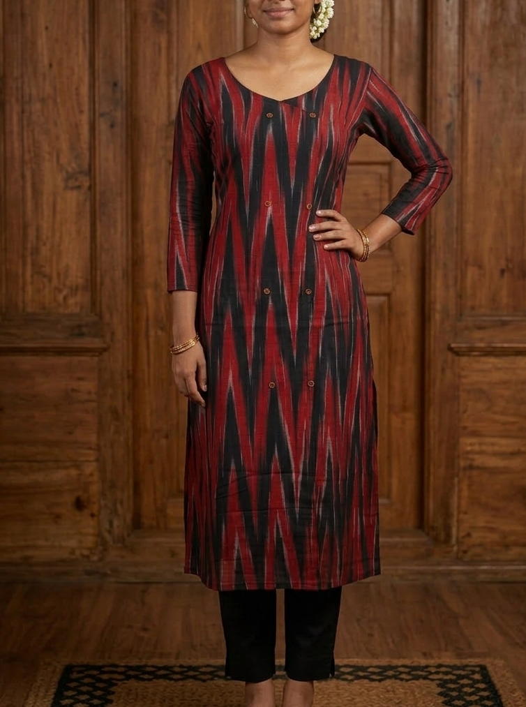 A-Line Ikat Print Kurti – Stylish 3/4 Sleeve(code:1433G) Meroon