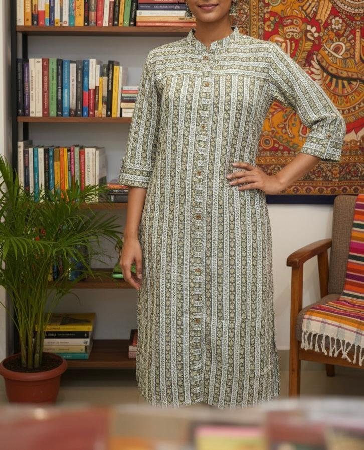 The kurti features a flattering silhouette with neat stitching, ensuring a relaxed yet polished look. Its lightweight fabric drapes beautifully, offering all-day ease without compromising on style. Pair it with leggings, palazzos, or jeans to create versatile everyday outfits.