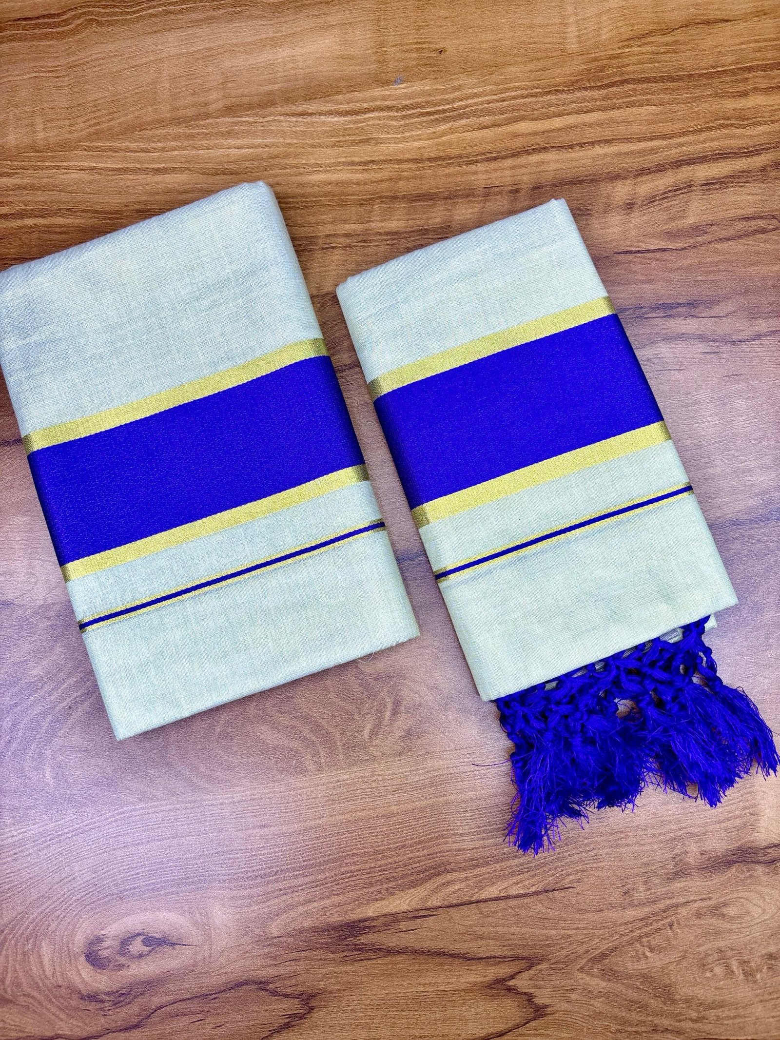 Design: Elegant soft Tissue 3” Karayum kasavum Set Mund with kunjalam & fine detailing
