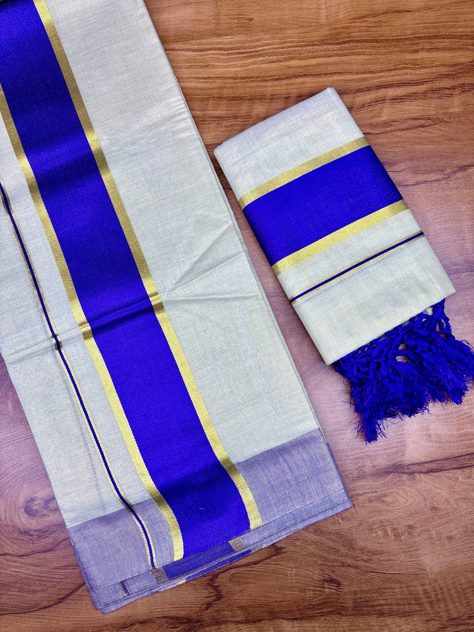 Experience timeless Kerala elegance with our Premium soft Tissue 3” lite blue colour Karayum kasavum Set Mund, crafted from high-quality, soft cotton for superior comfort and durability. This traditional 2-piece attire embodies the grace of Kerala’s cultural heritage, highlighted by the signature soft Tissue 3” Karayum kasavum Set Mund that adds a touch of sophistication to your festive and ethnic look.