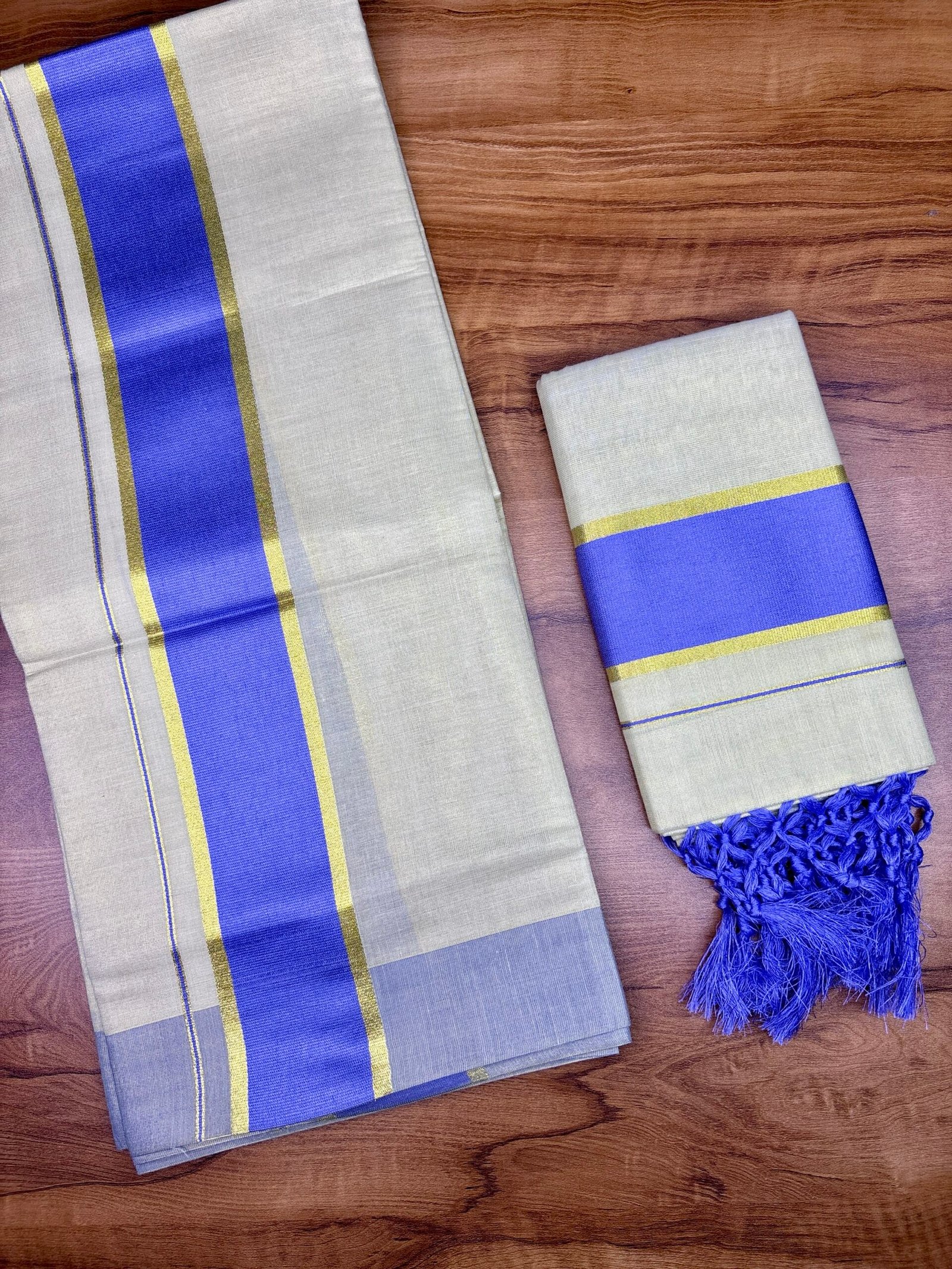 Experience timeless Kerala elegance with our Premium soft Tissue 3” lite blue colour Karayum kasavum Set Mund, crafted from high-quality, soft cotton for superior comfort and durability. This traditional 2-piece attire embodies the grace of Kerala’s cultural heritage, highlighted by the signature soft Tissue 3” Karayum kasavum Set Mund that adds a touch of sophistication to your festive and ethnic look.