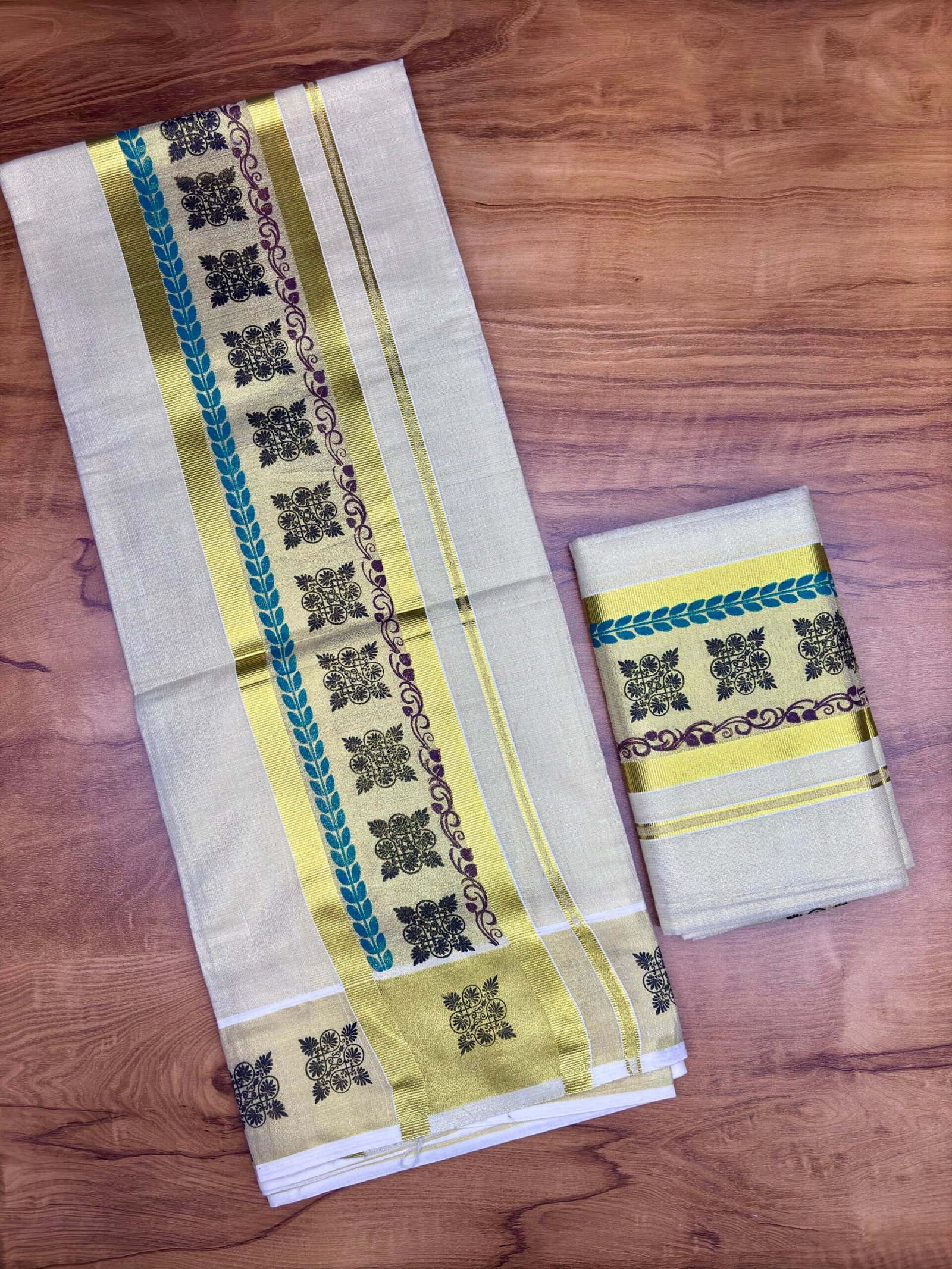 Color: Classic Kerala white with traditional border accents