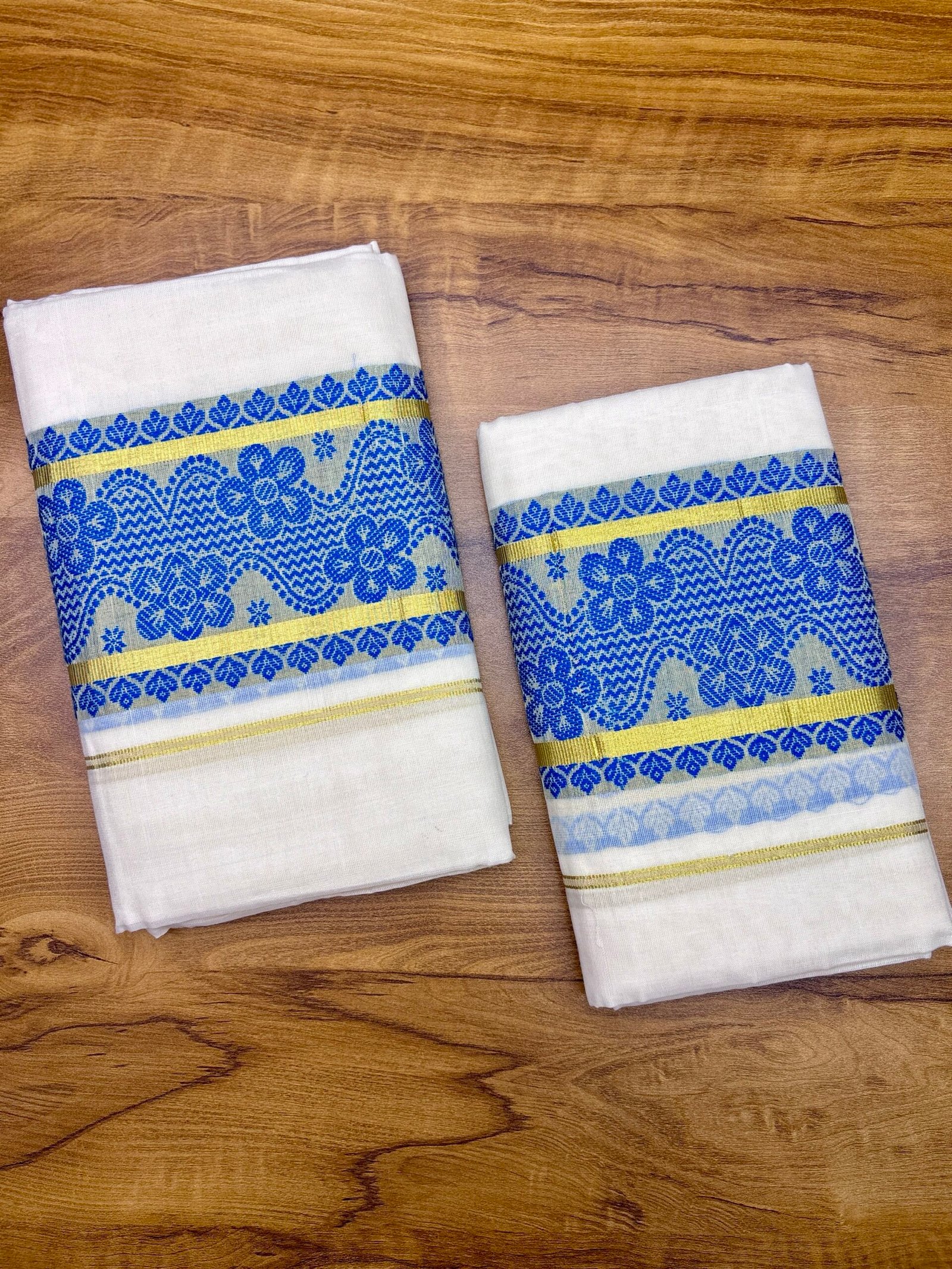 Experience timeless Kerala elegance with our 6 inch Golden and Blue colour kara Set Mund crafted from high-quality, soft cotton for superior comfort and durability. This traditional 2-piece attire embodies the grace of Kerala’s cultural heritage, highlighted by the signature Set Mund that adds a touch of sophistication to your festive and ethnic look.
