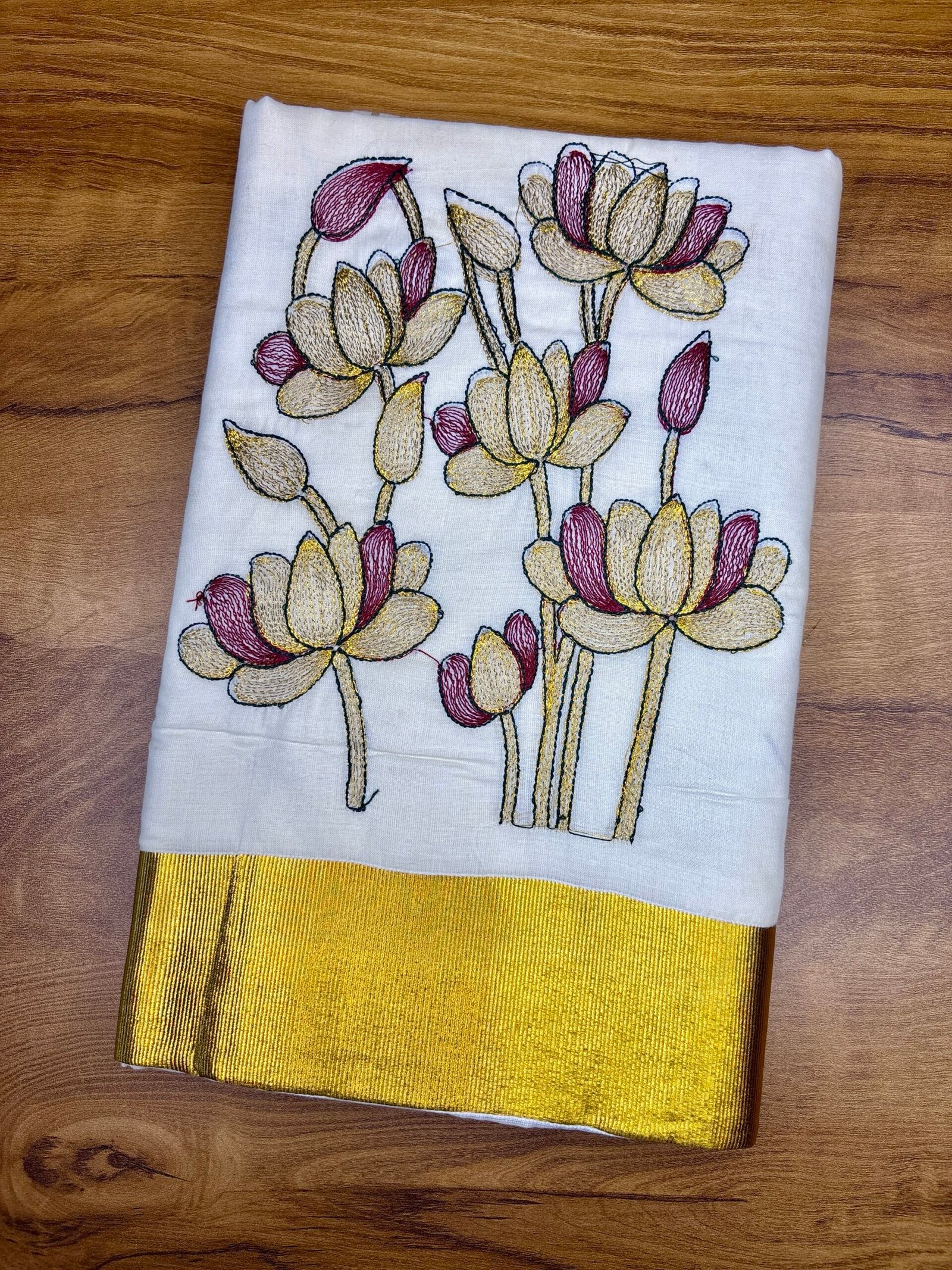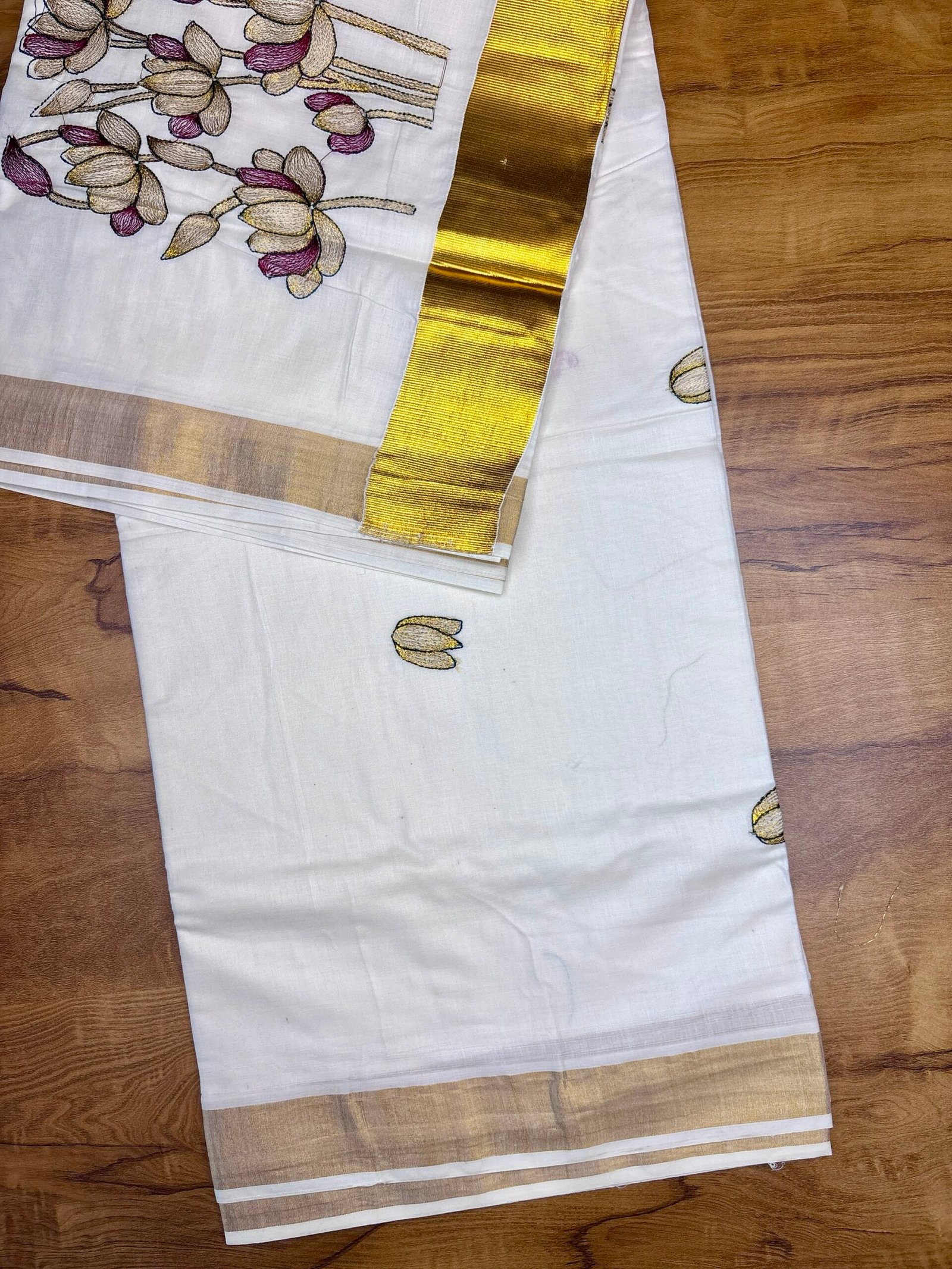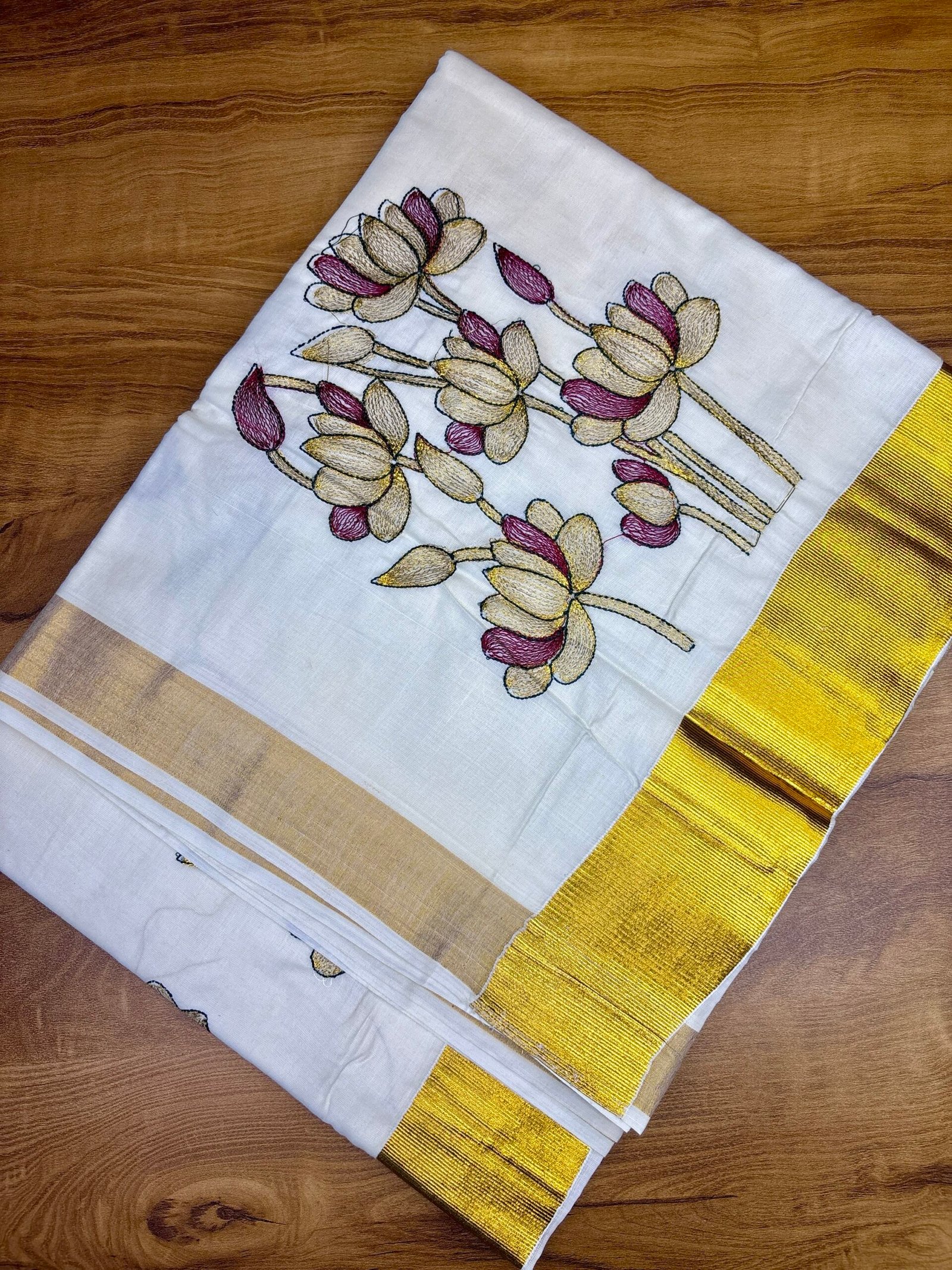 Be the first to review “Kerala Saree with Hand-Style Lotus Embroidery”