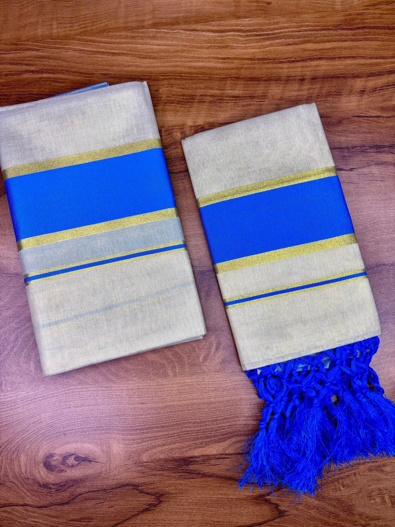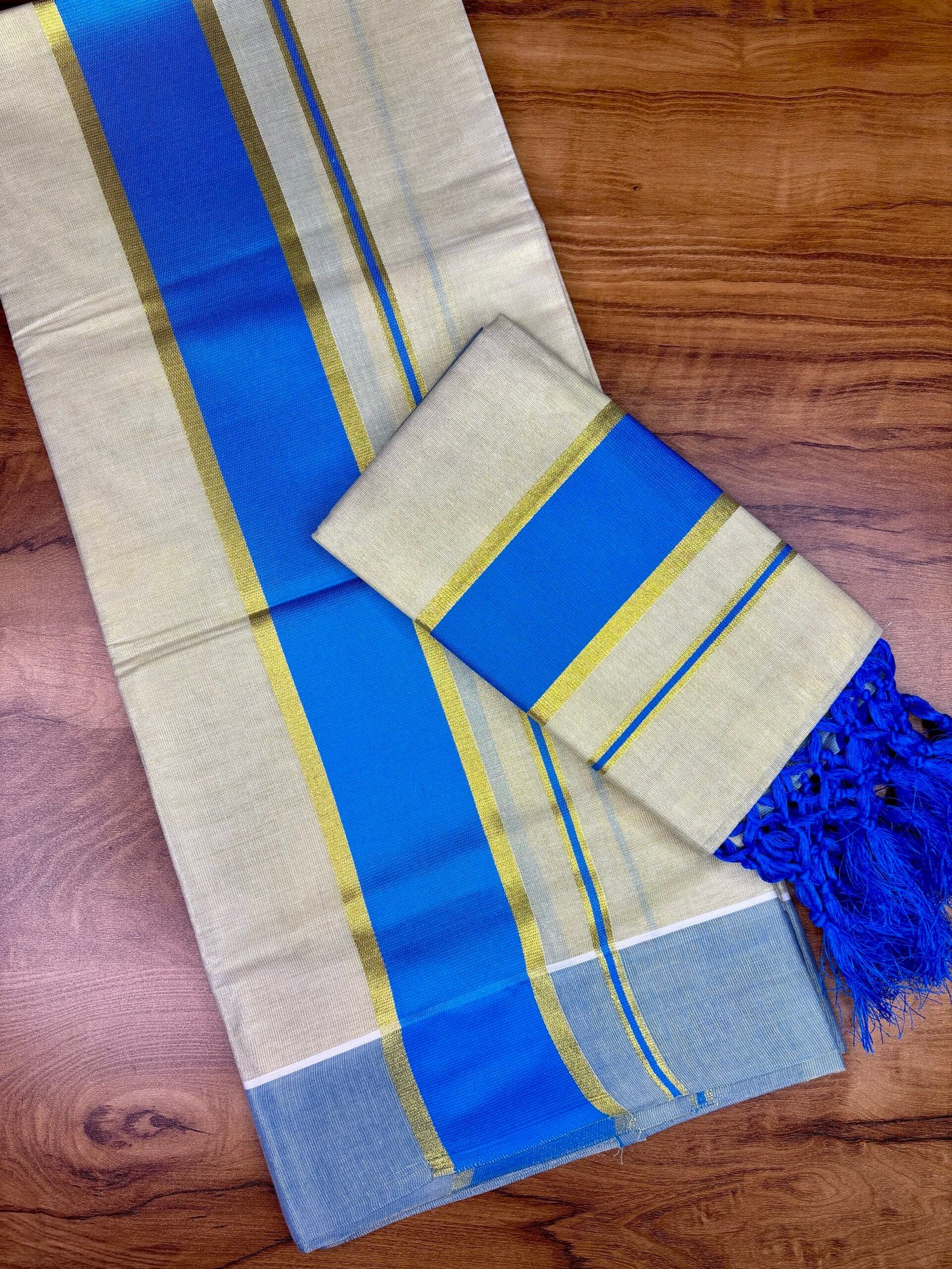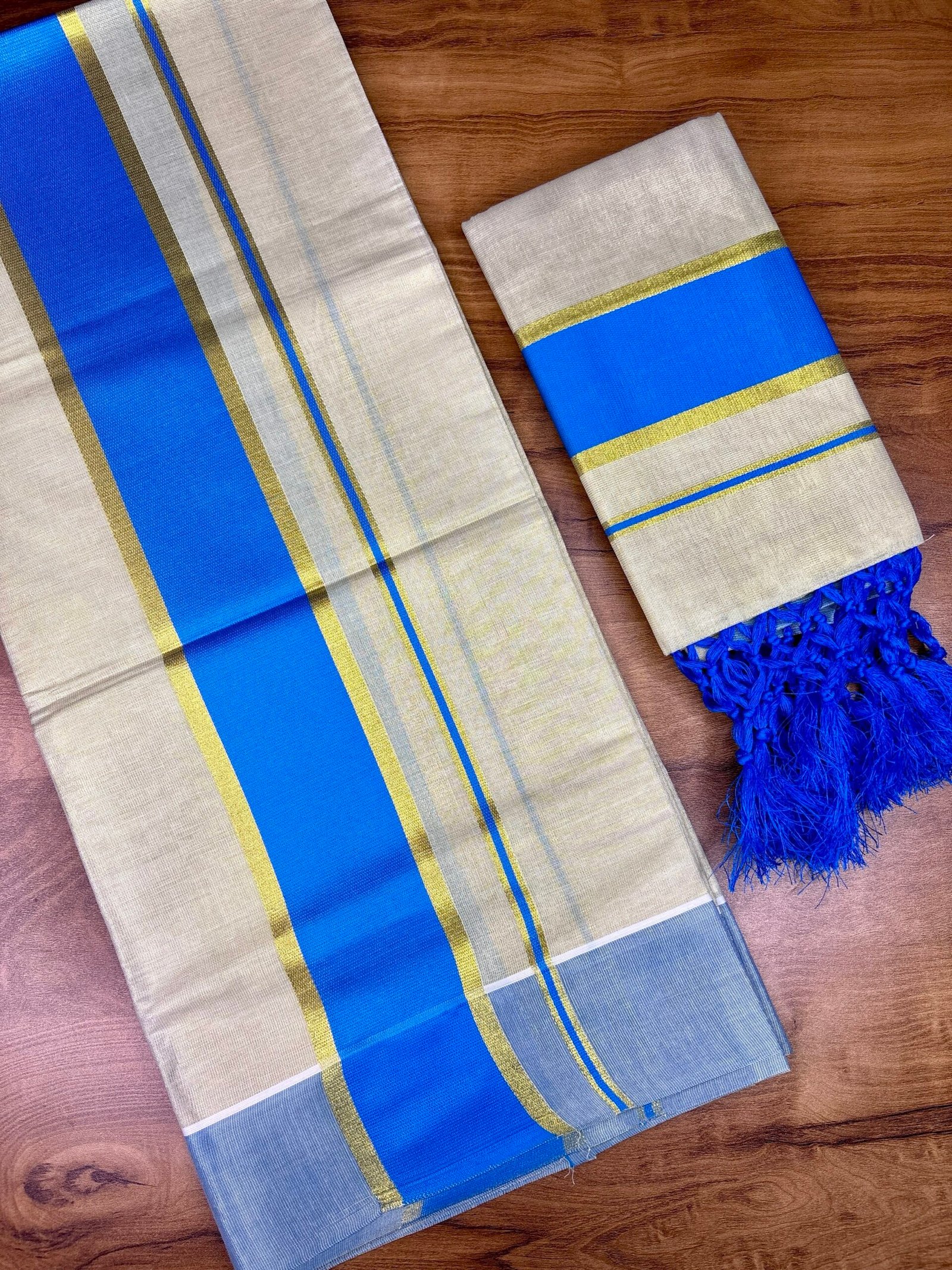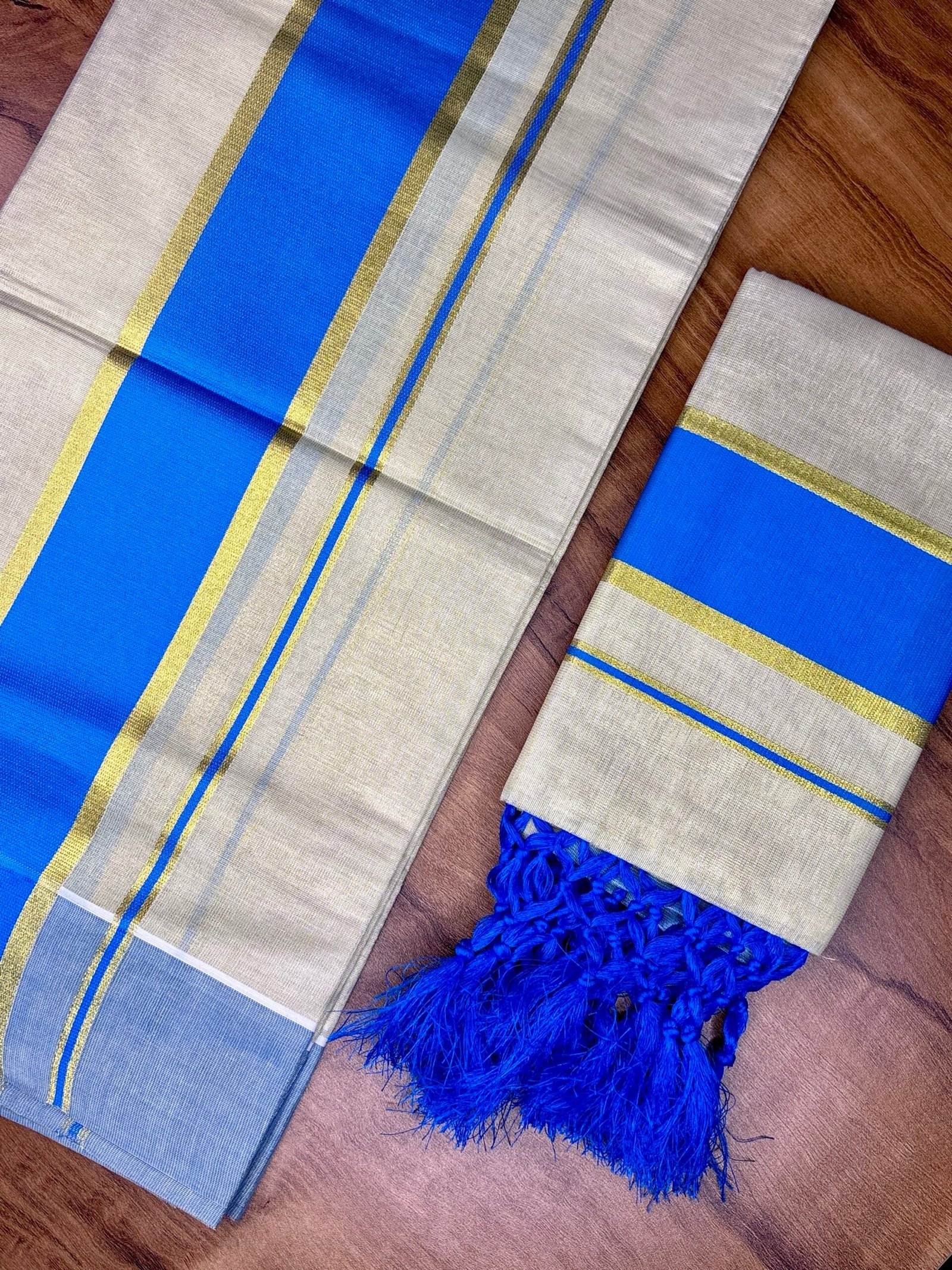 Experience timeless Kerala elegance with our Premium soft Tissue 3” lite blue colour Karayum kasavum Set Mund, crafted from high-quality, soft cotton for superior comfort and durability. This traditional 2-piece attire embodies the grace of Kerala’s cultural heritage, highlighted by the signature soft Tissue 3” Karayum kasavum Set Mund that adds a touch of sophistication to your festive and ethnic look.