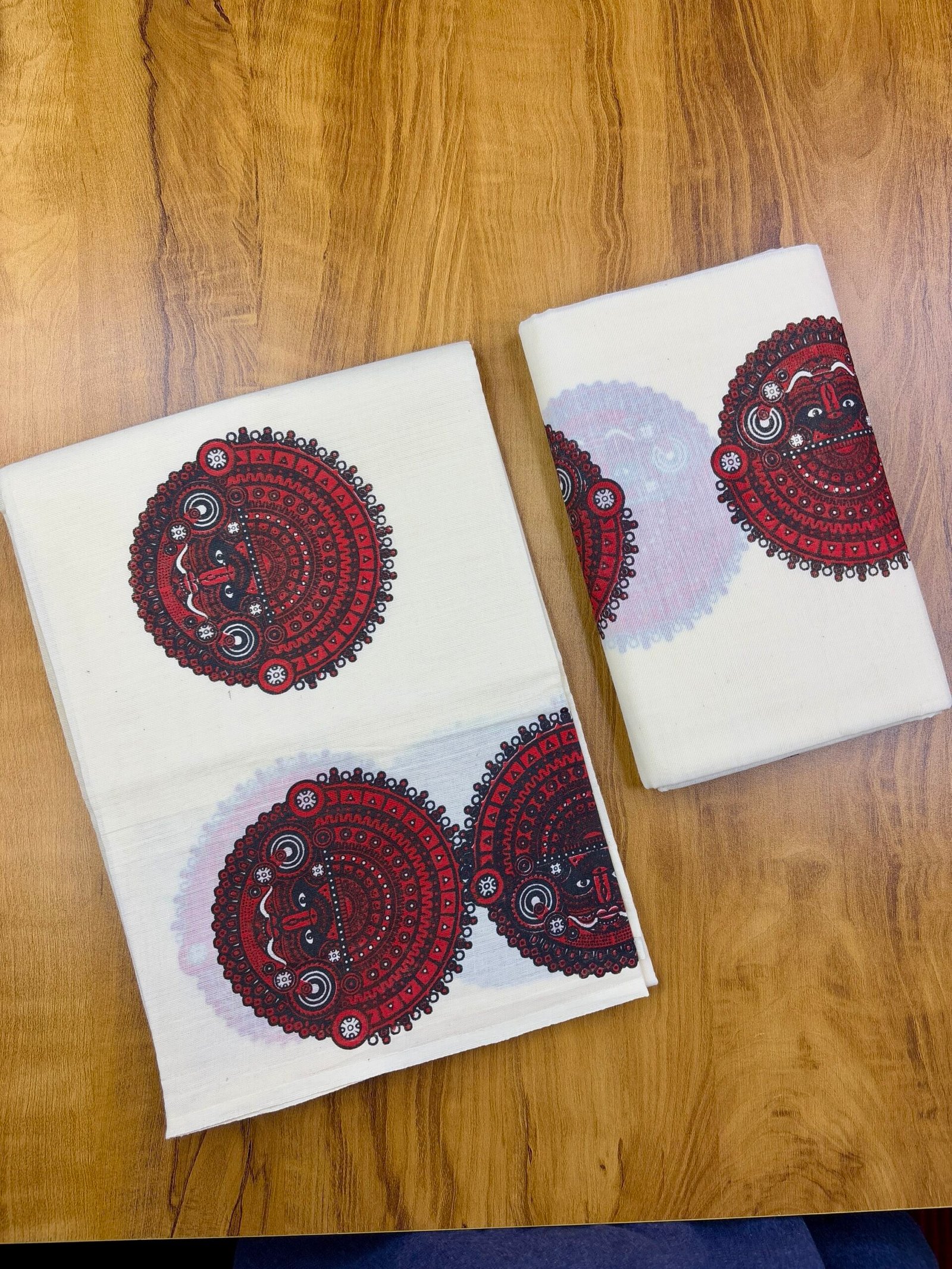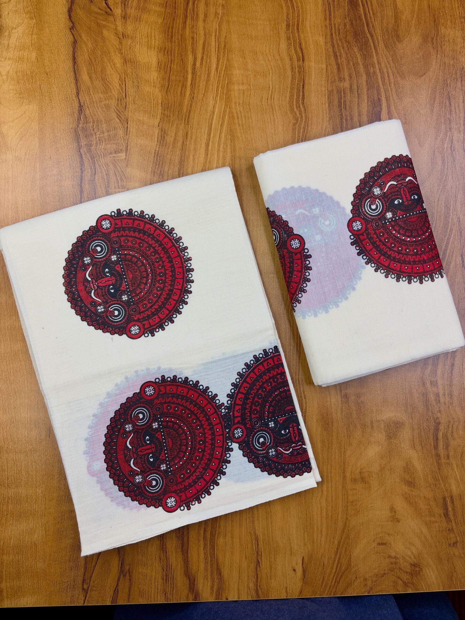 Experience timeless Kerala elegance with our Premium 5 inch theyyam print Cotton Set Mund, crafted from high-quality, soft cotton for superior comfort and durability. This traditional 2-piece attire embodies the grace of Kerala’s cultural heritage, highlighted by the signature 5 inch theyyam print border that adds a touch of sophistication to your festive and ethnic look.