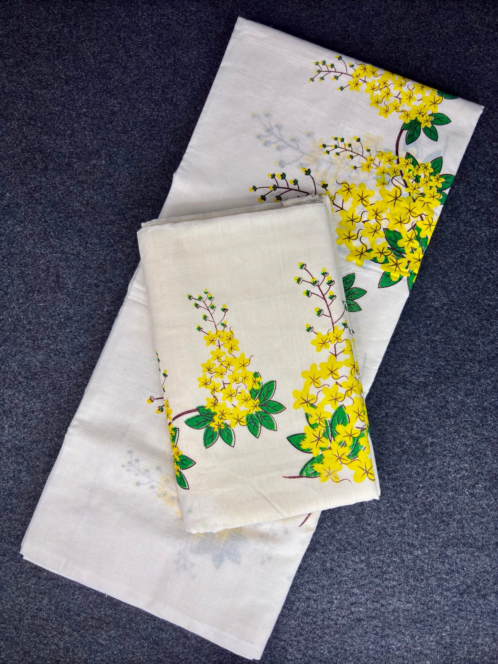Celebrate the spirit of Vishu in traditional elegance with this beautifully crafted Kanikonna printed Gada cotton set mundu. Designed to reflect Kerala’s rich cultural heritage, this premium set mundu features vibrant floral prints inspired by the iconic Vishu flower, making it perfect for festive occasions.