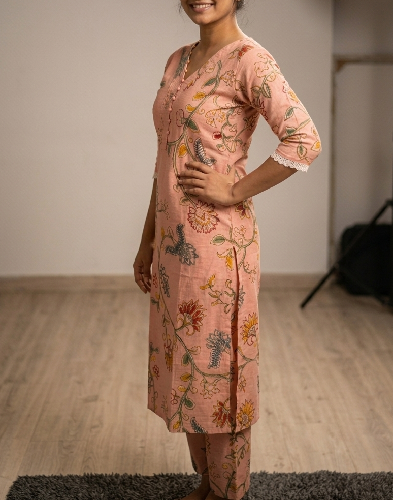 Add effortless elegance to your wardrobe with this women’s floral printed slitted co-ord set, designed for both comfort and modern ethnic style. This beautiful kurti and pant set for women features a flattering V-neck design with front detailing and stylish side slits, creating a sleek and fashionable silhouette.