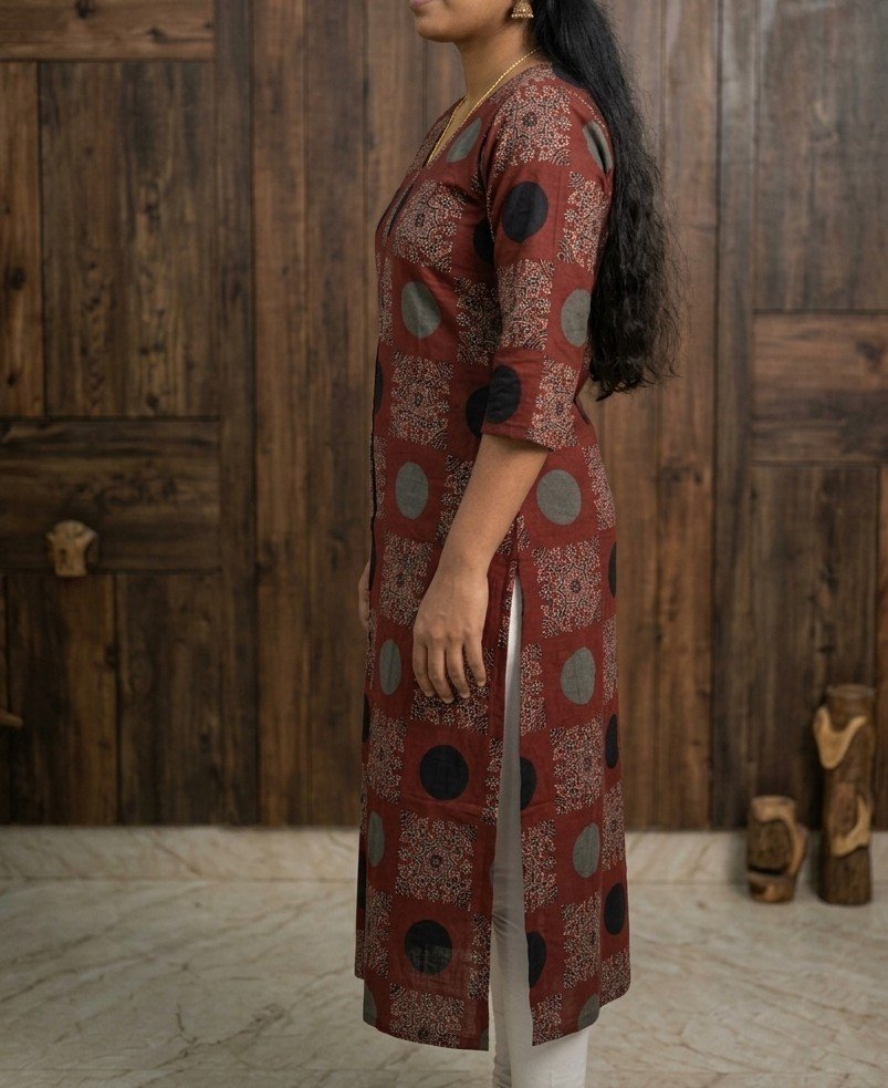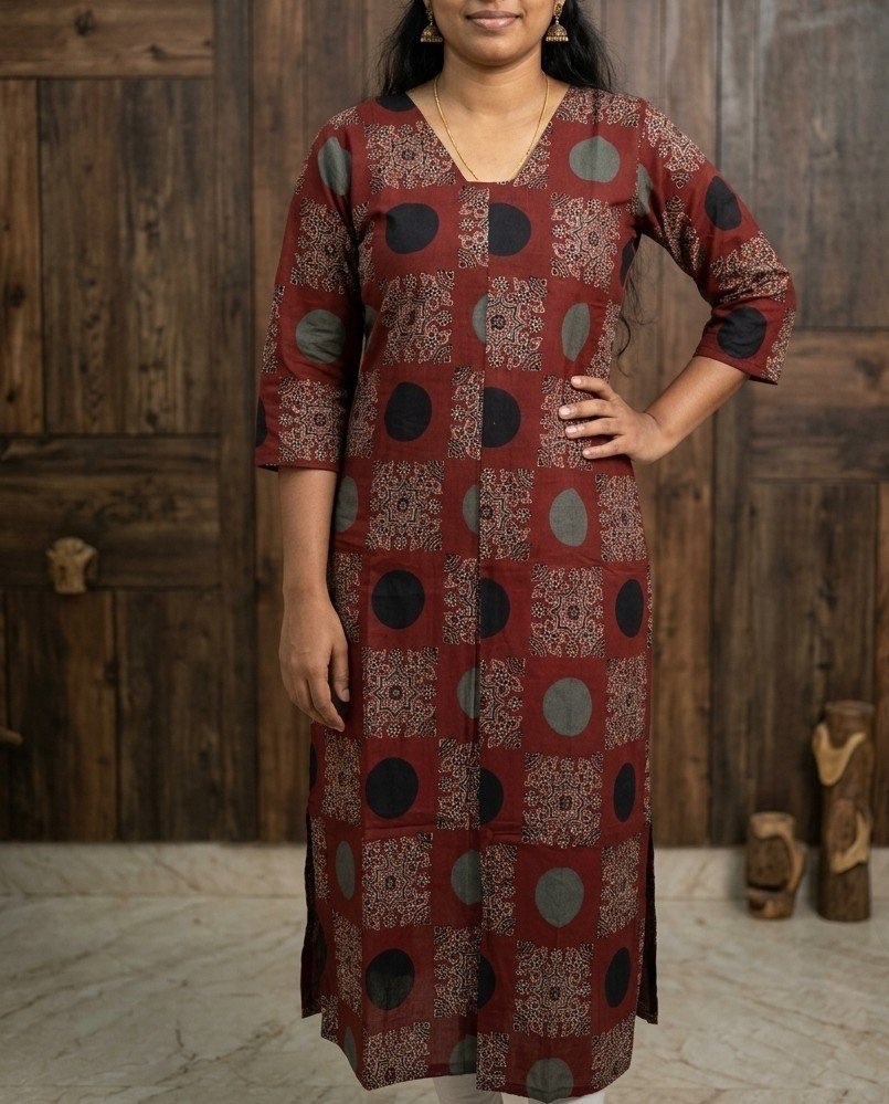 A perfect blend of traditional Ajrak charm and contemporary design, this kurti offers comfort, elegance, and versatility for your everyday wardrobe.