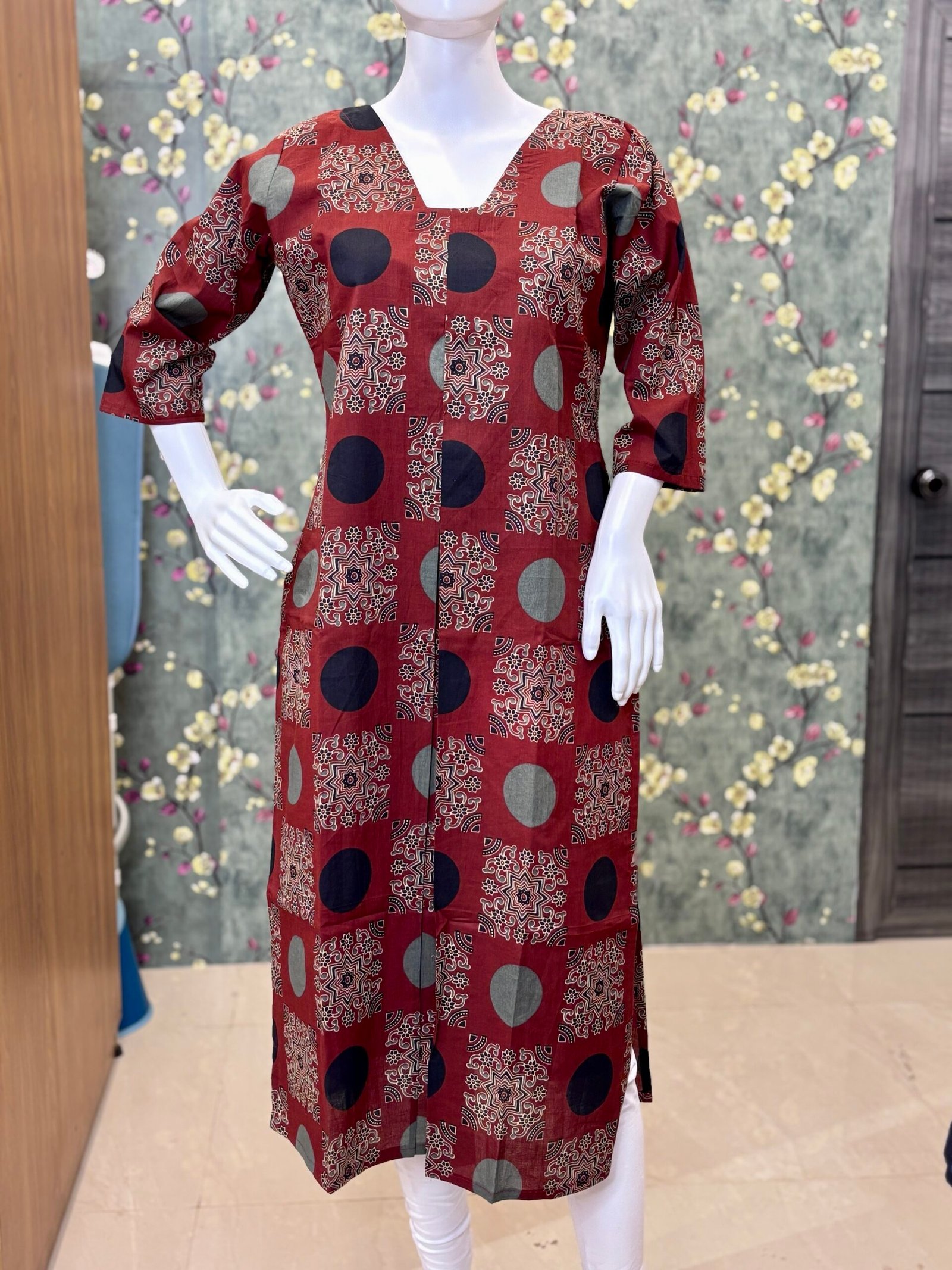 Women’s Ajrak Cotton Kurti with Lining | 3/4 Sleeves Straight Fit with Box Pleat Detail 2