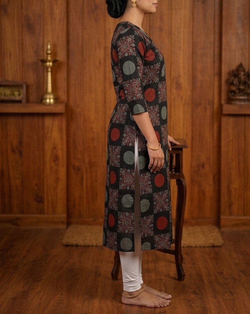 Women’s Ajrak Cotton Kurti with Lining | 3/4 Sleeves Straight Fit with Box Pleat Detail 2