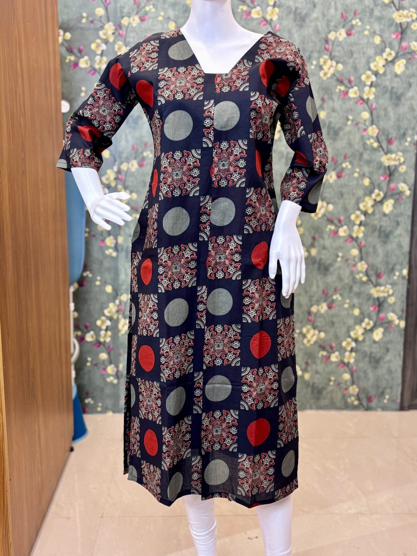 Pair this kurti with contrast pants or cigarette bottoms and minimal accessories for a classy, effortless look.