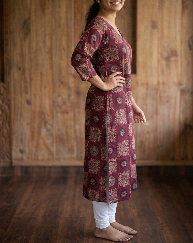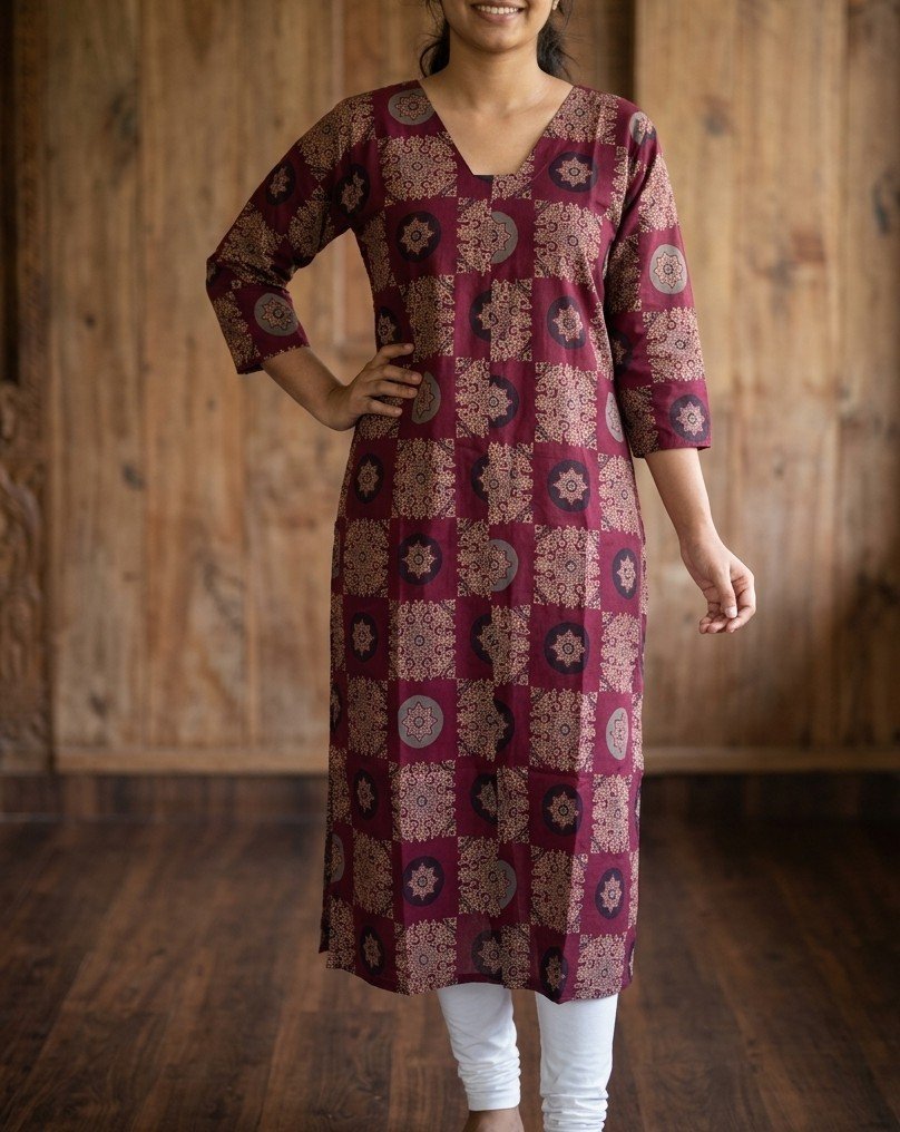 A perfect blend of traditional Ajrak charm and contemporary design, this kurti offers comfort, elegance, and versatility for your everyday wardrobe.