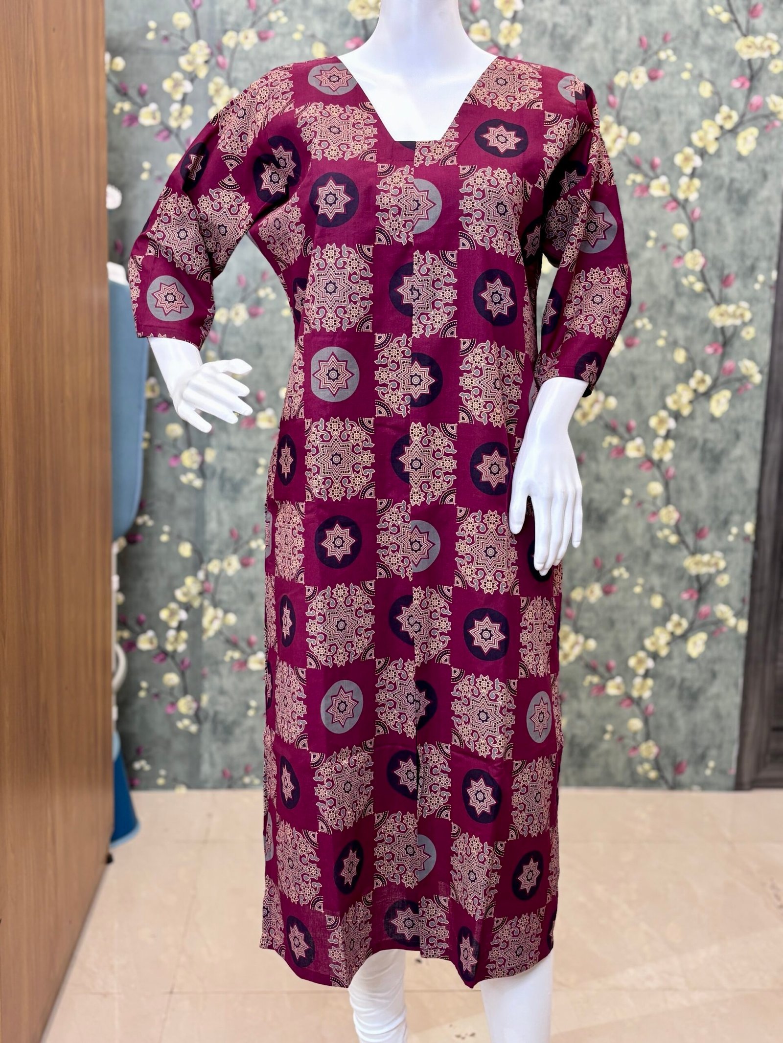 The kurti features a comfortable lining for better fit and coverage, along with a stylish front slit pattern that enhances ease of movement. The front portion is beautifully highlighted with box pleats, adding structure and a refined look to the overall design. With its straight-cut silhouette and 3/4 sleeves, this kurti is perfect for everyday wear, office styling, or casual outings.