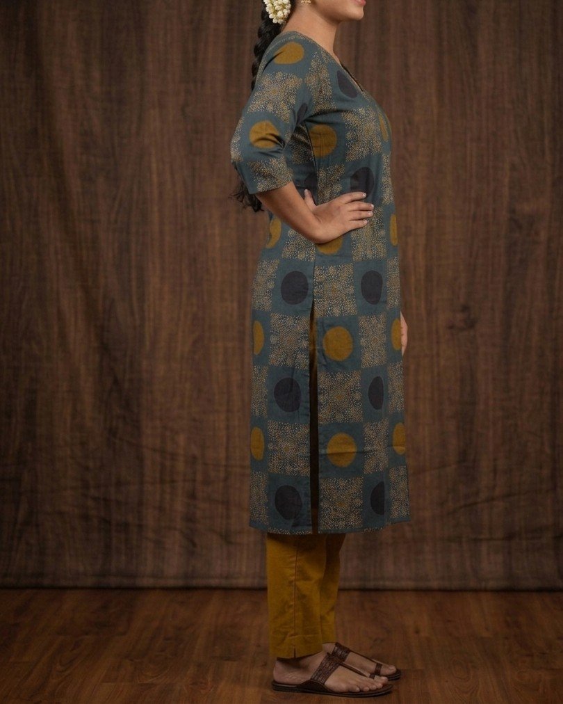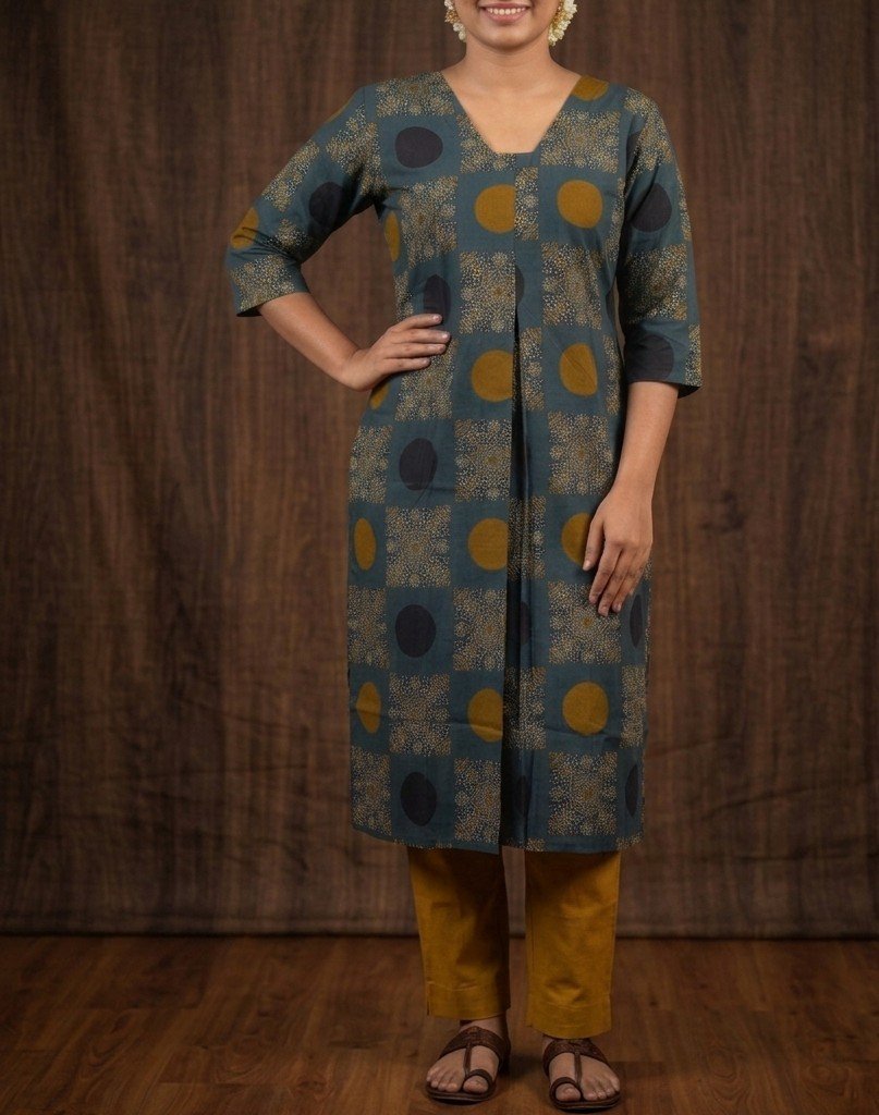 Pair this kurti with contrast pants or cigarette bottoms and minimal accessories for a classy, effortless look.