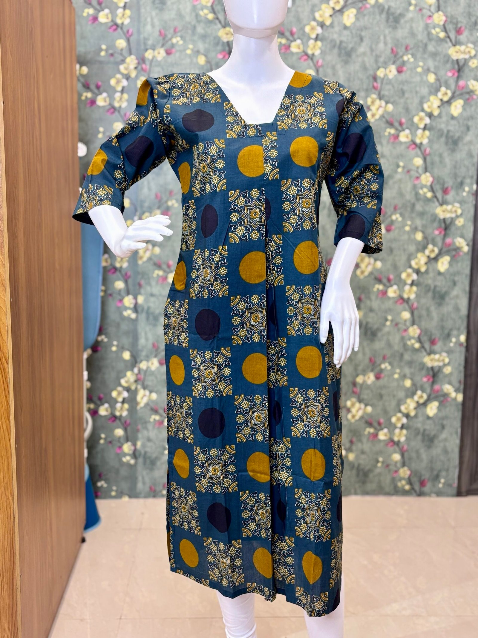 The kurti features a comfortable lining for better fit and coverage, along with a stylish front slit pattern that enhances ease of movement. The front portion is beautifully highlighted with box pleats, adding structure and a refined look to the overall design. With its straight-cut silhouette and 3/4 sleeves, this kurti is perfect for everyday wear, office styling, or casual outings.